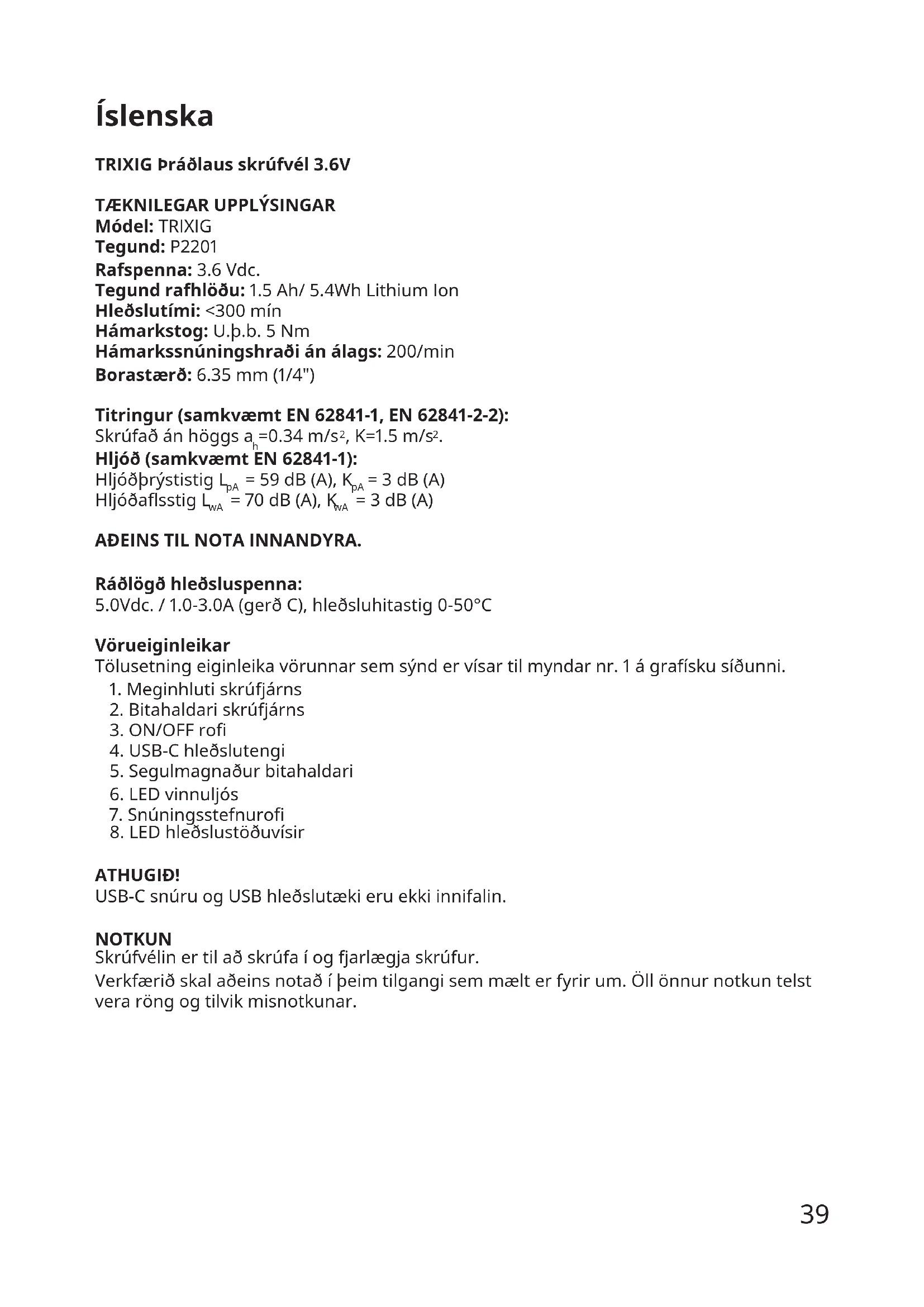 ATHUGIÐ! USB-C snúru og USB hleðslutæki eru ekki innifalin. NOTKUN Skrúfvélin er til að skrúfa í og fjarlægja skrúfur. Verkfærið skal aðeins notað í þeim tilgangi sem mælt er fyrir um. Öll önnur notkun telst vera röng og tilvik misnotkunar.40