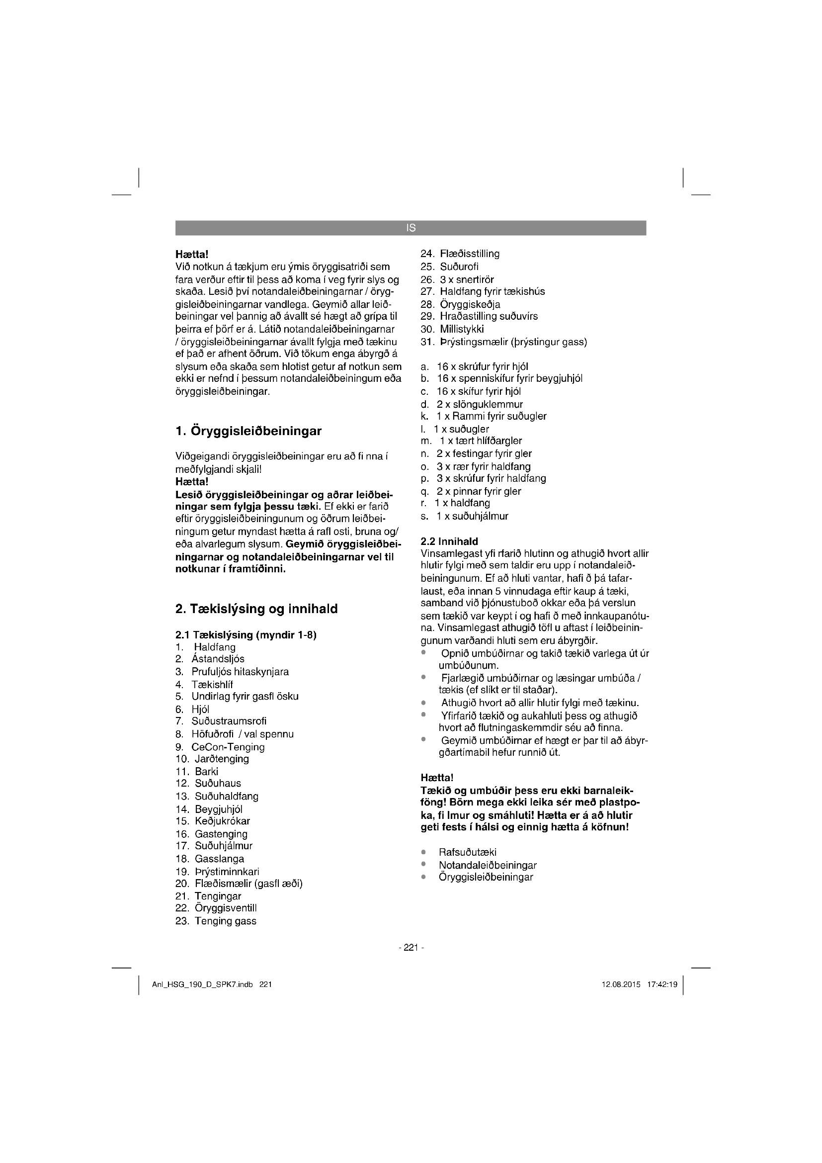 Sérstök skilyrði fyrir lönd Evrópubandalagsins: Kastið ekki notuðum rafmagnstækjum í vanalega ruslatunnu. Samkvæmt reglugerð fyrir Evrópu 2012/19/EU um gömul rafmangstæki og samkvæmt breytingum í lagasetningu hverrar þjóðar sambandsins verður að safna raftækjum aðskilið og koma fleim í sérstaka endurvinnslu í flágu umhverfi sverndar. Í staðinn fyrir að senda tækin til baka er eigandi þeirra hvattur til að vinna að því að rétt endurvinnsla eigi sér stað þegar hann afsalar sér tækinu sem eigandi. það er mögulegt að afhenda tækið til sérstakrar söfnunarstofnunar, sem sér um endurvinnslu tækisins samkvæmt lögum hinna ýmsu þjóða um endur- vinnslu og sorp. þetta á samt ekki við um viðbótarhluti, sem innihalda ekki rafmagnshluta. Eftirprentun eða önnur fjölprentun fylgiskjala og leiðarvísa vörunnar, líka í úrdrætti, er ekki leyfi leg nema grerinilegt samflykki frá iSC GmbH komi til. Það er áskilið að tæknilegar breytingar séu leyfi legar Anl_HSG_190_D_SPK7.indb 228Anl_HSG_190_D_SPK7.indb 228 12.08.2015 17:42:2012.08.2015 17:42:20IS
