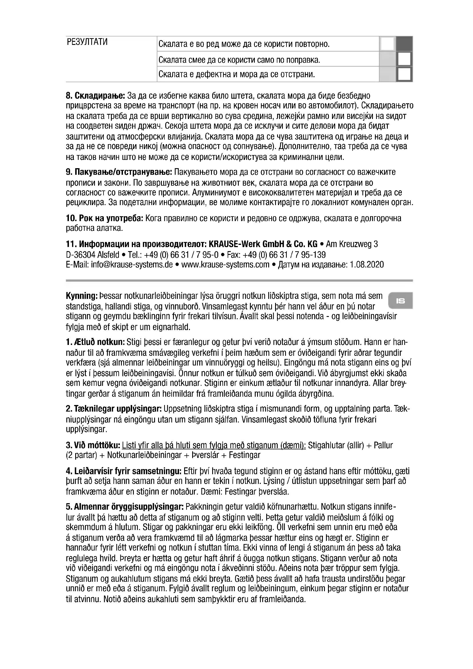 gaðilum, þarf að grannskoða hann reglulega af viðurkenndum aðlia til að gæta þess að hann sé í góðu ástandi (sjónrænt og með frammistöðuprófi). Ef sú er raunin, er nauðsynlegt að búa til eftirlitsáætlun sem inniheldur tegund, umfang og millibil þess sem eftirlitið er gert. Bil eftirlits þarf að vera ákveðið í samræmi við viðeigandi vinnuskilyrði, sérstaklega ef stiginn er mikið notaður, hleðslu sem sett er á stigann og tíðni og alvarlegi þeirra galla sem fundist hafa í fyrra eftirliti. Eigandi er einnig ábyrgur gagnvart því að taka gallaða stiga úr notkun á þann hátt að ekki sé hægt að nota þá fyrr en gert hefur verið við þá eða þeir fjarlægðir varanlega.Uvod: Ovo uputstvo za upotrebu opisuje bezbednu upotrebu zglobne merdevine koja se može koristiti kao stojeća merdevina, prislona merdevina i kao radna platforma. Pre korišćenja pažljivo pročitajte ovo uputstvo za upotrebu zbog razloga bezbednosti i sačuvajte isto za kasnije po