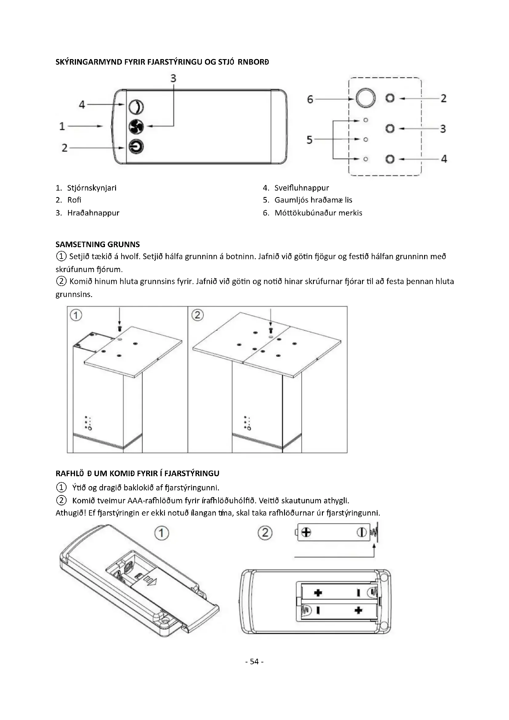 ① Ýtið og dragið baklokið af fjarstýringunni. ② Komið tveimur AAA-rafhlöðum fyrir í rafhlöðuhólfið. Veitið skautunum athygli. Athugið! Ef fjarstýringin er ekki notuð í langan tíma, skal taka rafhlöðurnar úr fjarstýringunni.- 55 - NOTKUNARLEIÐ BEININGAR