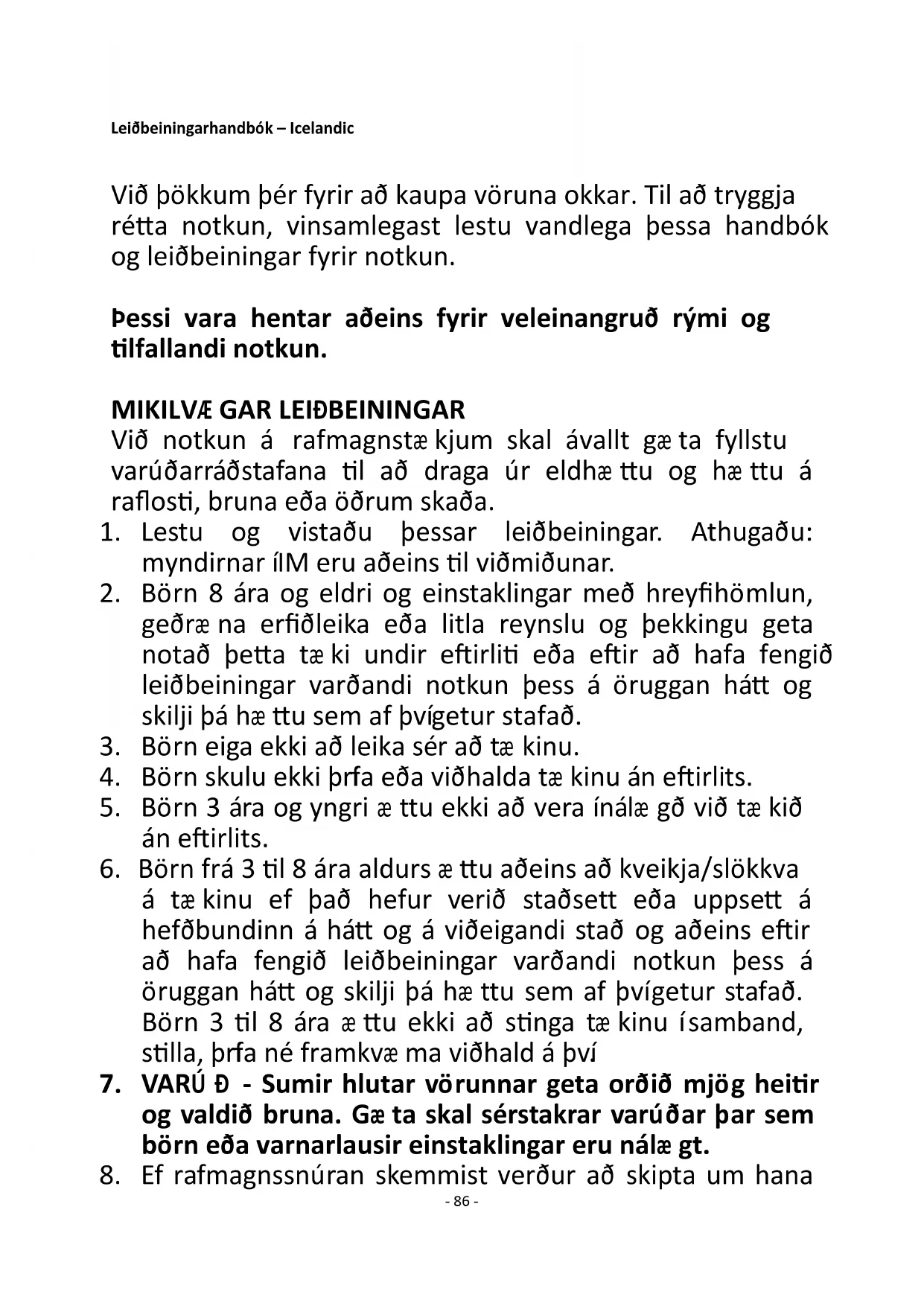 handbókinni. Ö ll önnur notkun sem ekki er mæ lt með af framleiðandanum gæ ti orsakað bruna, raflost eða skaða á fólki.