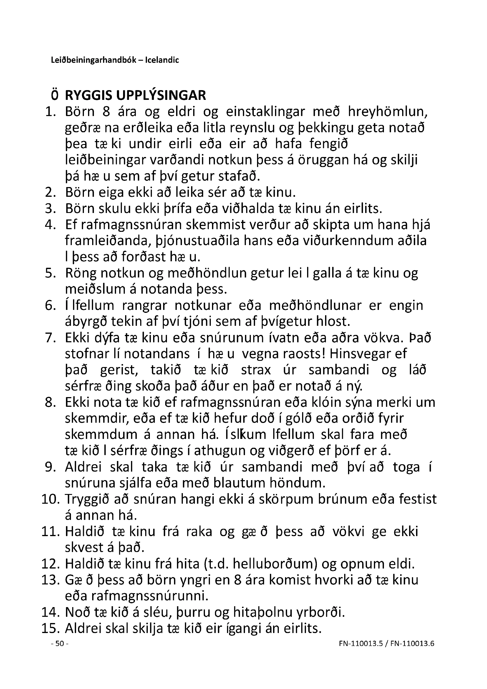 15. Aldrei skal skilja tæ kið eftir í gangi án eftirlits.- 51 - FN-110013.5 / FN-110013.6