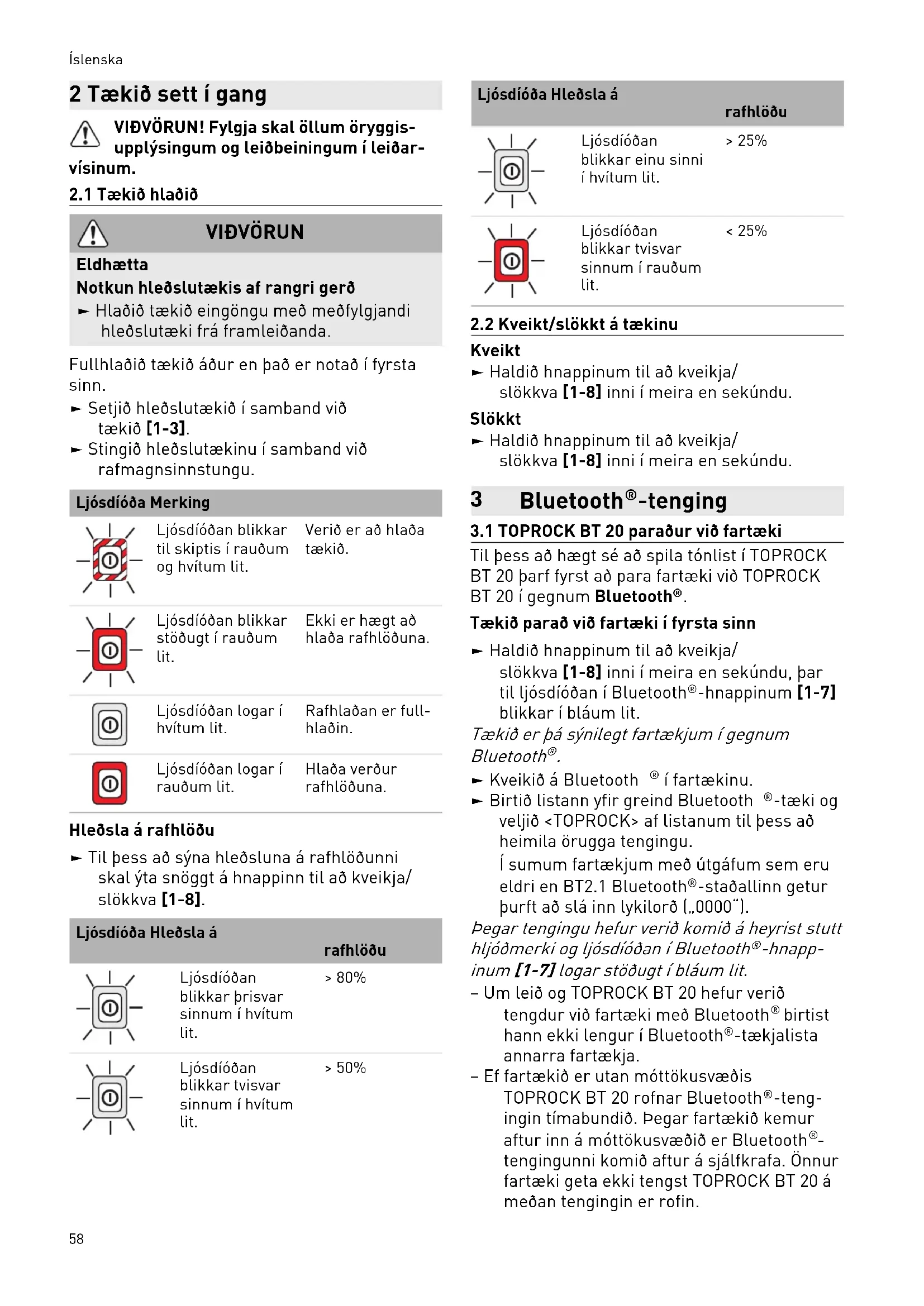-Eiginleikar Bluetooth -tengingarinnar geta verioismunandi eftir paraoa fartaekinu hverju sinni. Aour en fartaeki er parao vio TOPROCK BT 20 kal alltaf ganga ur skugga um ao Bluetooth virki retti fartaekinu.