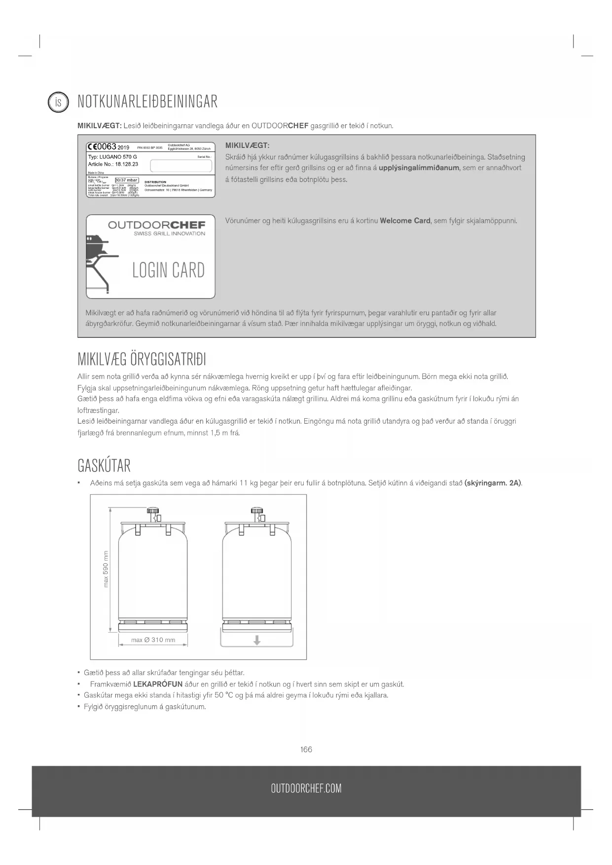 - Gaskútar mega ekki standa í hitastigi yfir 50 °C og þá má aldrei geyma í lokuðu rými eða kjallara. • Fylgið öryggisreglunum á gaskútunum. MIKILVÆGT:Skráið hjá ykkur raðnúmer kúlugasgrillsins á bakhlið þessara notkunarleiðbeininga. Staðsetning númersins fer eftir gerð grillsins og er að finna á upplýsingalímmiðanum, sem er annaðhvort á fótastelli grillsins eða botnplötu þess.Vörunúmer og heiti kúlugasgrillsins eru á kortinu Welcome Card, sem fylgir skjalamöppunni. Mikilvægt er að hafa raðnúmerið og vörunúmerið við höndina til að flýta fyrir fyrirspurnum, þegar varahlutir eru pantaðir og fyrir allar ábyrgðarkröfur. Geymið notkunarleiðbeiningarnar á vísum stað. Þær innihalda mikilvægar upplýsingar um öryggi, notkun og viðhald. LOGIN CARD CE Label 2019 LUGANO 570 G Outdoorchef AGEggbühlstrasse 28, 8050 Zürich - Switzerland Created byANB Realised by anbVersion date21.06.2018 Replace Page 1 of 1File Nr. PM 10058-86File name CE Label 2019 LUGANO G Label size 45x105 side burner )Qn=3.2kW (228g/h 2AAR12CT130900137 2AAR12 CT1309 0 0 1 3 7