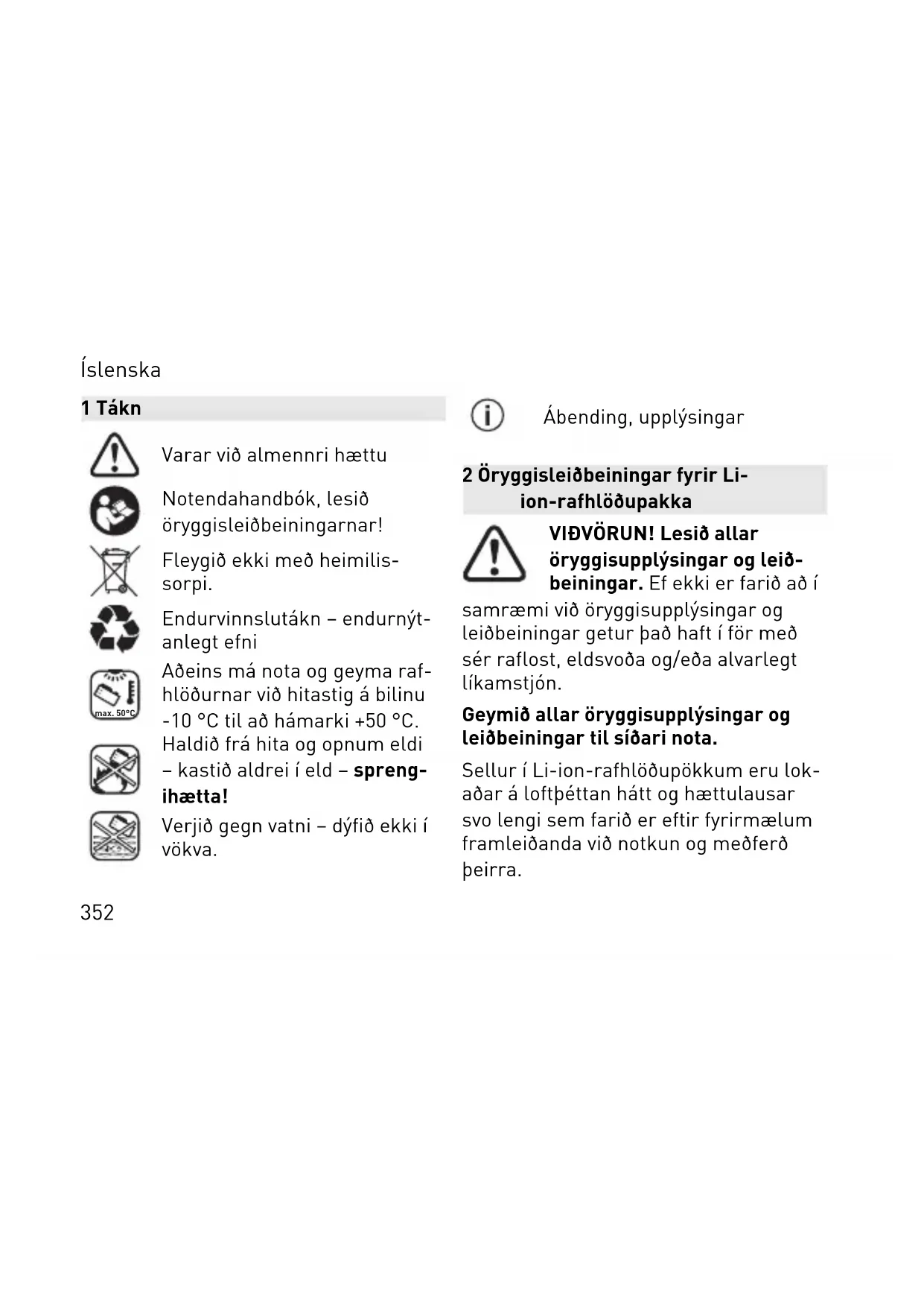 eða rafhlöðupakkinn er tengdur við fartæki Leiftrandi blátt ljós Íslenska 358Rafhlöðupakkinn er tilbúinn fyrir teng ingu við fartækið (t.d. fyrir hugbúnaðar uppfærslu) Rafhlöðupakkinn notar Bluet ooth