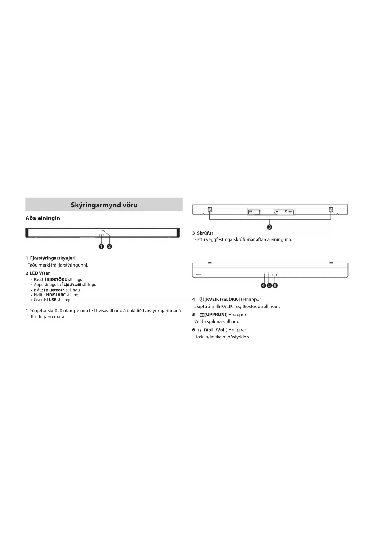 Virkni vísisljóss Eiginleikar Skjár Aðgerð Kveikt á sjálfvirkri biðstöðu Gult-gult-gult, hratt Ljóstækni stilling, „Fyrri“ - „Fyrri“ - „Næsta“ - „Næsta“ Slökkt á sjálfvirkum biðstöðu Gult-gult-gult, hægt Kveikt á sjálfvirkri vökustillingu Hvítt-Hvítt-Grænt-Grænt Hátalari: „Uppruni“ + „Vol.+“ Slökkt á sjálfvirkri vökustillingu Hvítt-Hvítt-Rautt-Rautt Hljóðstyrkstakmark Ljósið blikkar 3 sinnum Stilla hljóðstyrk Bluetooth pörun Rautt-Blátt-Rautt-Blátt...... Í Bluetooth stillingu, ýttu á og haltu inni spilunarhnappinum Tókst ekki að spila Rautt-Grænt-Rautt-Grænt..... Umhverfishljóð kveikt Ljosi. blikkar 5 sinnum, hratt Ýtið á „SURR“ Umhvefishljóð slökk Ljósið blikkar 5 sinnum, hægt DTS stafrænt umhvefishljóð Blágrænn-Blágrænn-Blágrænn, hratt DTS merki móttekið Dolby Digital Grænt-Grænt-Grænt, hratt Dolby merki móttekið Bassa uppörvun kveikt Ljosi. blikkar 3 sinnum, hratt Ljóstækni stilling, „Fyrri“ + „Spila“+“Næsta“ Bassa uppörvun slökkt Ljósið blikkar 3 sinnum, hægtLJÓSTÆKNI / HDMI ARC aðgerð 1 Gakktu úr skugga um að tækið sé tengt við sjónvarpið eða hljóðtækið. 2 Ýttu endurtekið á hnappinn á tækinu eða á fjarstýringunni til að velja LJÓSTÆKNI, HDMI ARC stilling. 3 Notaðu hljóðtækið beint fyrir spilunareiginleika. 4 Ýttu á VOL +/– hnappinn til að stilla hljóðstyrkinn eins og hentar. Ábendingar: