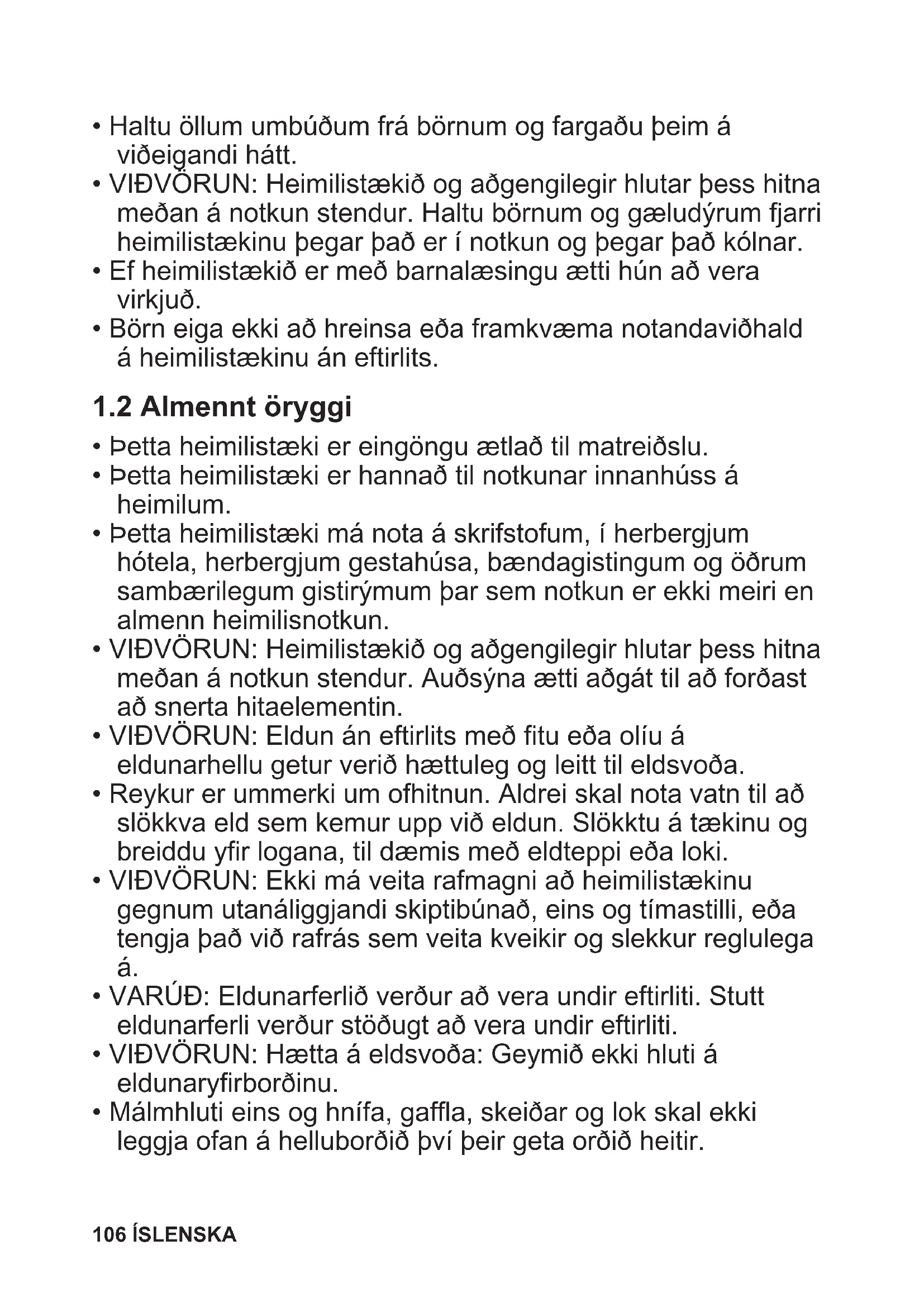 - Börn, 8 ára og eldri og fólk með minnkaða líkamlega-, skyn- eða andlega getu, eða sem skortir reynslu og þekkingu, mega nota þetta tæki, ef þau eru undir eftirliti eða hafa verið veittar leiðbeiningar varðandi örugga notkun tækisins og ef þau skilja hættuna sem því fylgir. Halda skal börnum yngri en 8 ára gömlum og fólki með mjög miklar og flóknar fatlanir frá heimilistækinu, nema þau séu undir stöðugu eftirliti.