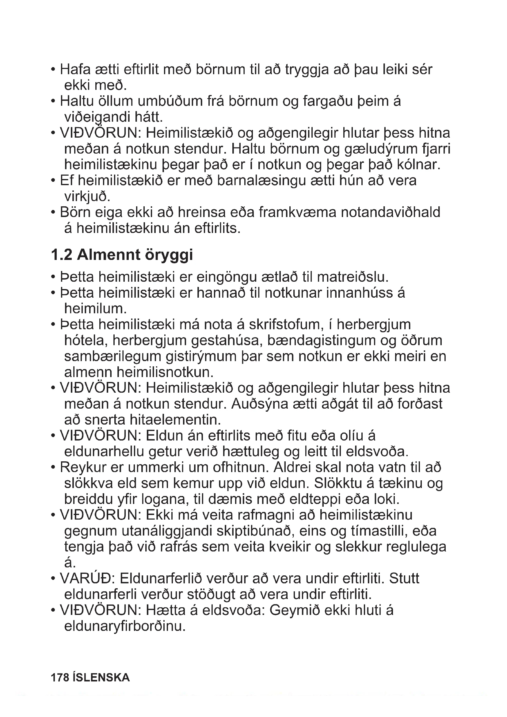 - Börn, 8 ára og eldri og fólk með minnkaða líkamlega-, skyn- eða andlega getu, eða sem skortir reynslu og þekkingu, mega nota þetta tæki, ef þau eru undir eftirliti eða hafa verið veittar leiðbeiningar varðandi örugga notkun tækisins og ef þau skilja hættuna sem því fylgir. Halda skal börnum yngri en 8 ára gömlum og fólki með mjög miklar og flóknar fatlanir frá heimilistækinu, nema þau séu undir stöðugu eftirliti. ÍSLENSKA 177• Hafa ætti eftirlit með börnum til að tryggja að þau leiki sér ekki með.
