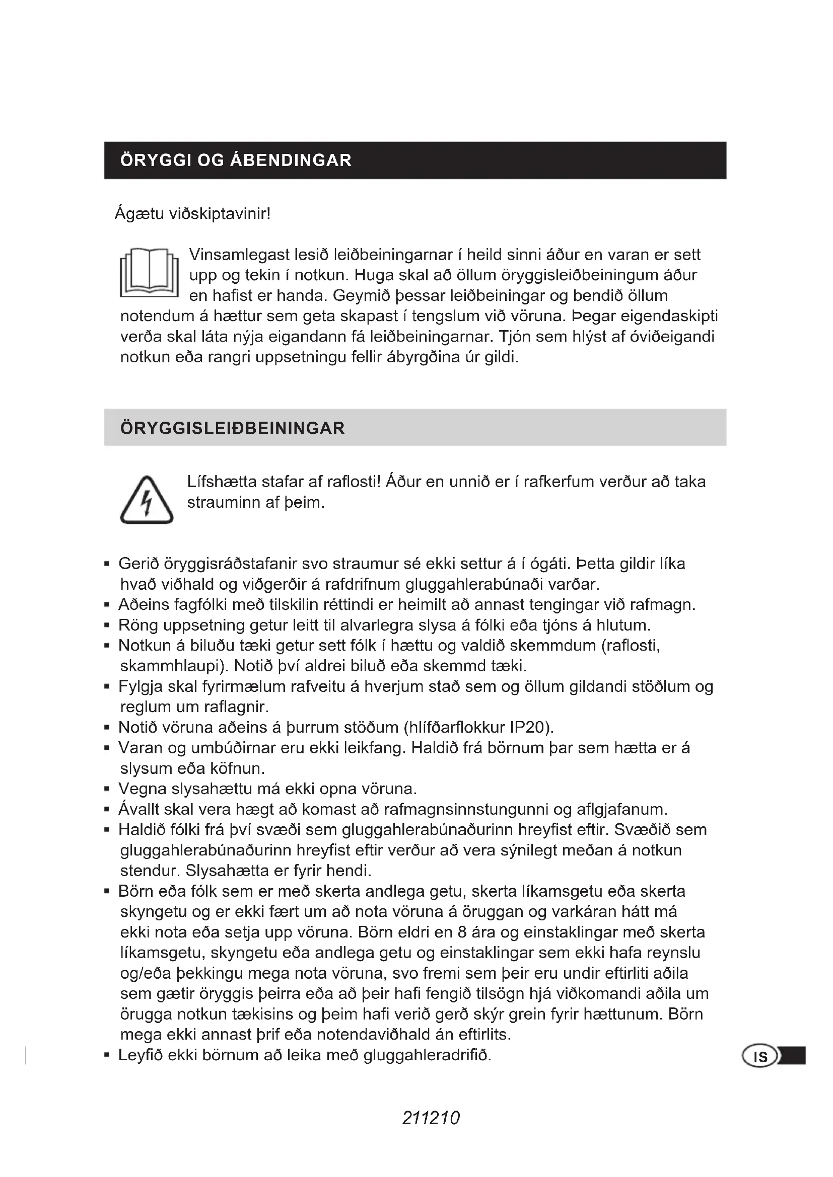 Ágætu viðskiptavinir! Vinsamlegast lesið leiðbeiningarnar í heild sinni áður en varan er sett upp og tekin í notkun Huga skal að öllum öryggisleiðbeiningum áður en hast er handa. Geymið þessar leiðbeiningar og bendið öllum notendum á hættur sem geta skapast í tengslum við vöruna. Þegar eigendaskipti verða skal láta nýja eigandann fá leiðbeiningarnar. Tjón sem hlýst af óviðeigandi notkun eða rangri uppsetningu fellir ábyrgðina úr gildi. ÖRYGGISLEIÐBEININGAR Lífshætta stafar af raosti! Áður en unnið er í rafkerfum verður að taka strauminn af þeim. Gerið öryggisráðstafanir svo straumur sé ekki settur á í ógáti. Þetta gildir líka hvað viðhald og viðgerðir á rafdrifnum gluggahlerabúnaði varðar. Aðeins fagfólki með tilskilin réttindi er heimilt að annast tengingar við rafmagn Röng uppsetning getur leitt til alvarlegra slysa á fólki eða tjóns á hlutum. Notkun á biluðu tæki getur sett fólk í hættu og valdið skemmdum (raosti, skammhlaupi). Notið því aldrei biluð eða skemmd tæki. Fylgja skal fyrirmælum rafveitu á hverjum stað sem og öllum gildandi stöðlum og reglum um raagnir. Notið vöruna aðeins á þurrum stöðum (hlífðarokkur IP20). Varan og umbúðirnar eru ekki leikfang. Haldið frá börnum þar sem hætta er á slysum eða köfnun Vegna slysahættu má ekki opna vöruna Ávallt skal vera hægt að komast að rafmagnsinnstungunni og agjafanum. Haldið fólki frá því svæði sem gluggahlerabúnaðurinn hreyst eftir. Svæðið sem gluggahlerabúnaðurinn hreyst eftir verður að vera sýnilegt meðan á notkun stendur Slysahætta er fyrir hendi Börn eða fólk sem er með skerta andlega getu, skerta líkamsgetu eða skerta skyngetu og er ekki fært um að nota vöruna á öruggan og varkáran hátt má ekki nota eða setja upp vöruna. Börn eldri en 8 ára og einstaklingar með skerta líkamsgetu, skyngetu eða andlega getu og einstaklingar sem ekki hafa reynslu og/eða þekkingu mega nota vöruna, svo fremi sem þeir eru undir eftirliti aðila sem gætir öryggis þeirra eða að þeir ha fengið tilsögn hjá viðkomandi aðila um örugga notkun tækisins og þeim ha verið gerð skýr grein fyrir hættunum. Börn mega ekki annast þrif eða notendaviðhald án eftirlits. Leyð ekki börnum að leika með gluggahleradrið.212