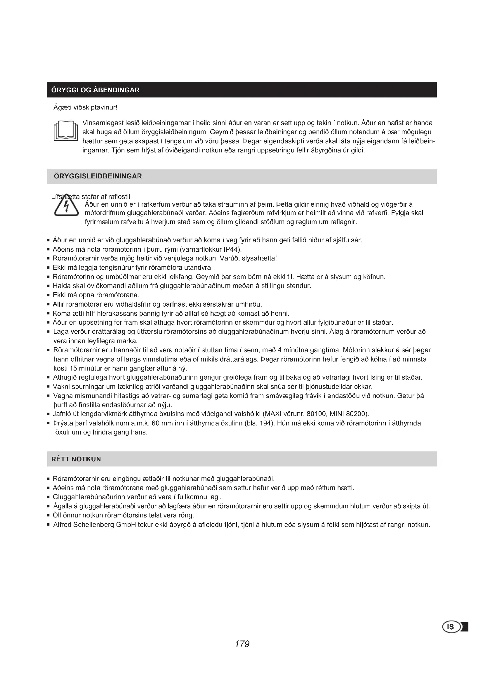 öRyGGI OG áBENDINGAR Ágæti viðskiptavinur! Vinsamlegast lesið leiðbeiningarnar í heild sinni áður en varan er sett upp og tekin í notkun. Áður en hast er handa skal huga að öllum öryggisleiðbeiningum. Geymið þessar leiðbeiningar og bendið öllum notendum á þær mögulegu hættur sem geta skapast í tengslum við vöru þessa. Þegar eigendaskipti verða skal láta nýja eigandann fá leiðbein- ingarnar. Tjón sem hlýst af óviðeigandi notkun eða rangri uppsetningu fellir ábyrgðina úr gildi. öRyGGISLEIðBEININGAR Lífshætta stafar af raosti! Áður en unnið er í rafkerfum verður að taka strauminn af þeim. Þetta gildir einnig hvað viðhald og viðgerðir á mótordrifnum gluggahlerabúnaði varðar. Aðeins faglærðum rafvirkjum er heimilt að vinna við rafker. Fylgja skal fyrirmælum rafveitu á hverjum stað sem og öllum gildandi stöðlum og reglum um raagnir. Áður en unnið er við gluggahlerabúnað verður að koma í veg fyrir að hann geti fallið niður af sjálfu sér. Aðeins má nota röramótorinn í þurru rými (varnarokkur IP44). Röramótorarnir verða mjög heitir við venjulega notkun. Varúð, slysahætta! Ekki má leggja tengisnúrur fyrir röramótora utandyra. Röramótorinn og umbúðirnar eru ekki leikfang. Geymið þar sem börn ná ekki til. Hætta er á slysum og köfnun. Halda skal óviðkomandi aðilum frá gluggahlerabúnaðinum meðan á stillingu stendur. Ekki má opna röramótorana. Allir röramótorar eru viðhaldsfríir og þarfnast ekki sérstakrar umhirðu. Koma ætti hlíf hlerakassans þannig fyrir að alltaf sé hægt að komast að henni. Áður en uppsetning fer fram skal athuga hvort röramótorinn er skemmdur og hvort allur fylgibúnaður er til staðar. Laga verður dráttarálag og útfærslu röramótorsins að gluggahlerabúnaðinum hverju sinni. Álag á röramótornum verður að vera innan leylegra marka. Röramótorarnir eru hannaðir til að vera notaðir í stuttan tíma í senn, með 4 mínútna gangtíma. Mótorinn slekkur á sér þegar hann ofhitnar vegna of langs vinnslutíma eða of mikils dráttarálags. Þegar röramótorinn hefur fengið að kólna í að minnsta kosti 15 mínútur er hann gangfær aftur á ný. Athugið reglulega hvort gluggahlerabúnaðurinn gengur greiðlega fram og til baka og að vetrarlagi hvort ísing er til staðar. Vakni spurningar um tæknileg atriði varðandi gluggahlerabúnaðinn skal snúa sér til þjónustudeildar okkar. Vegna mismunandi hitastigs að vetrar og sumarlagi geta komið fram smávægileg frávik í endastöðu við notkun. Getur þá þurft að fínstilla endastöðurnar að nýju. Jafnið út lengdarvikmörk átthyrnda öxulsins með viðeigandi valshólki (MAXI vörunr. 80100, MINI 80200). Þrýsta þarf valshólkinum a.m.k. 60 mm inn í átthyrnda öxulinn (bls. 194). Hún má ekki koma við röramótorinn í átthyrnda öxulnum og hindra gang hans. RéTT NOTKUN Röramótorarnir eru eingöngu ætlaðir til notkunar með gluggahlerabúnaði. Aðeins má nota röramótorana með gluggahlerabúnaði sem settur hefur verið upp með réttum hætti. Gluggahlerabúnaðurinn verður að vera í fullkomnu lagi. Ágalla á gluggahlerabúnaði verður að lagfæra áður en röramótorarnir eru settir upp og skemmdum hlutum verður að skipta út. Öll önnur notkun röramótorsins telst vera röng. Alfred Schellenberg GmbH tekur ekki ábyrgð á aeiddu tjóni, tjóni á hlutum eða slysum á fólki sem hljótast af rangri notkun.180