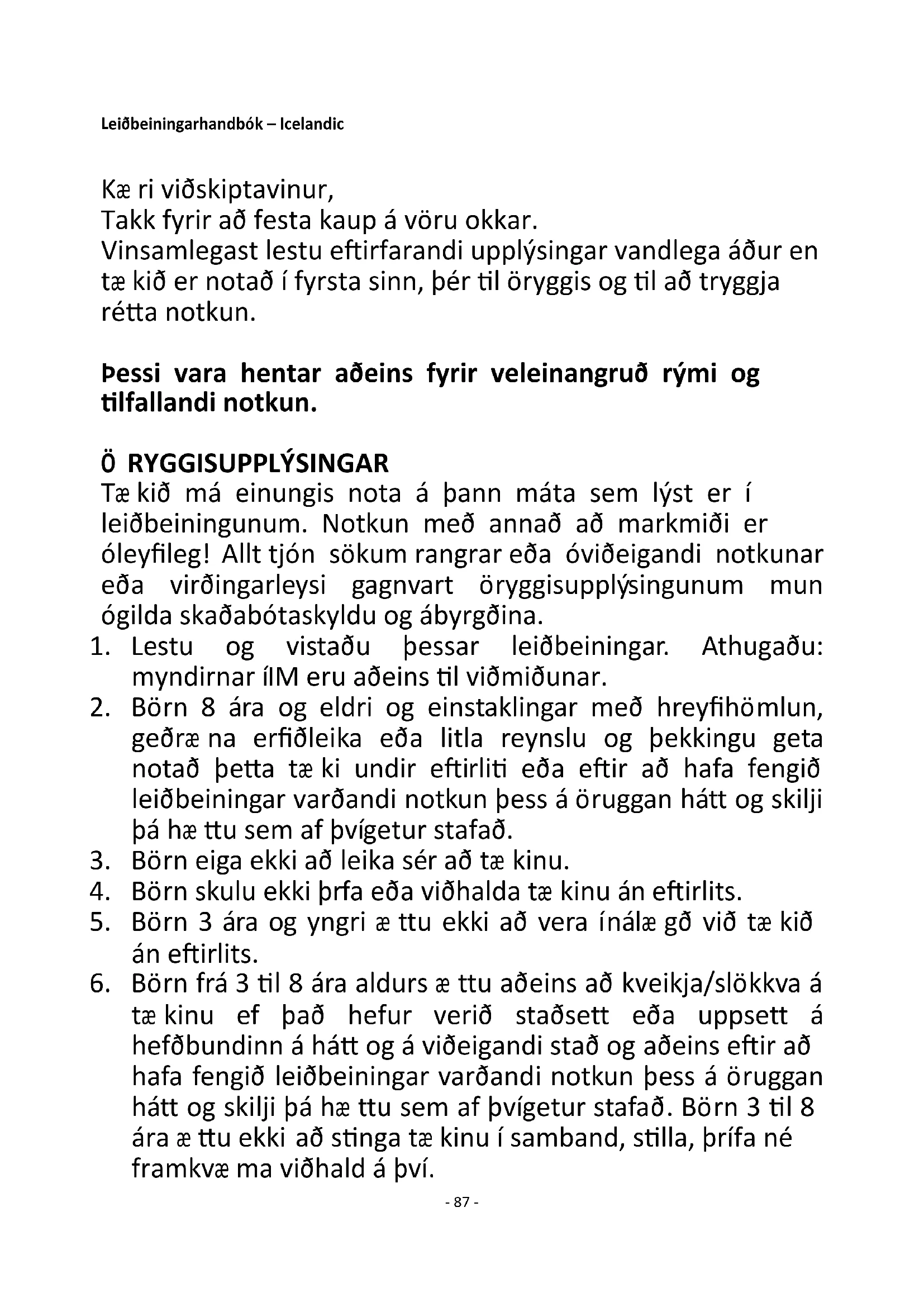 tæ kinu ef það hefur verið staðsett eða uppsett á hefðbundinn á hátt og á viðeigandi stað og aðeins eftir að hafa fengið leiðbeiningar varðandi notkun þess á öruggan hátt og skilji þá hæ ttu sem af því getur stafað. Börn 3 til 8 ára æ ttu ekki að stinga tæ kinu í samband, stilla, þrífa né framkvæ ma viðhald á því.- 88 -