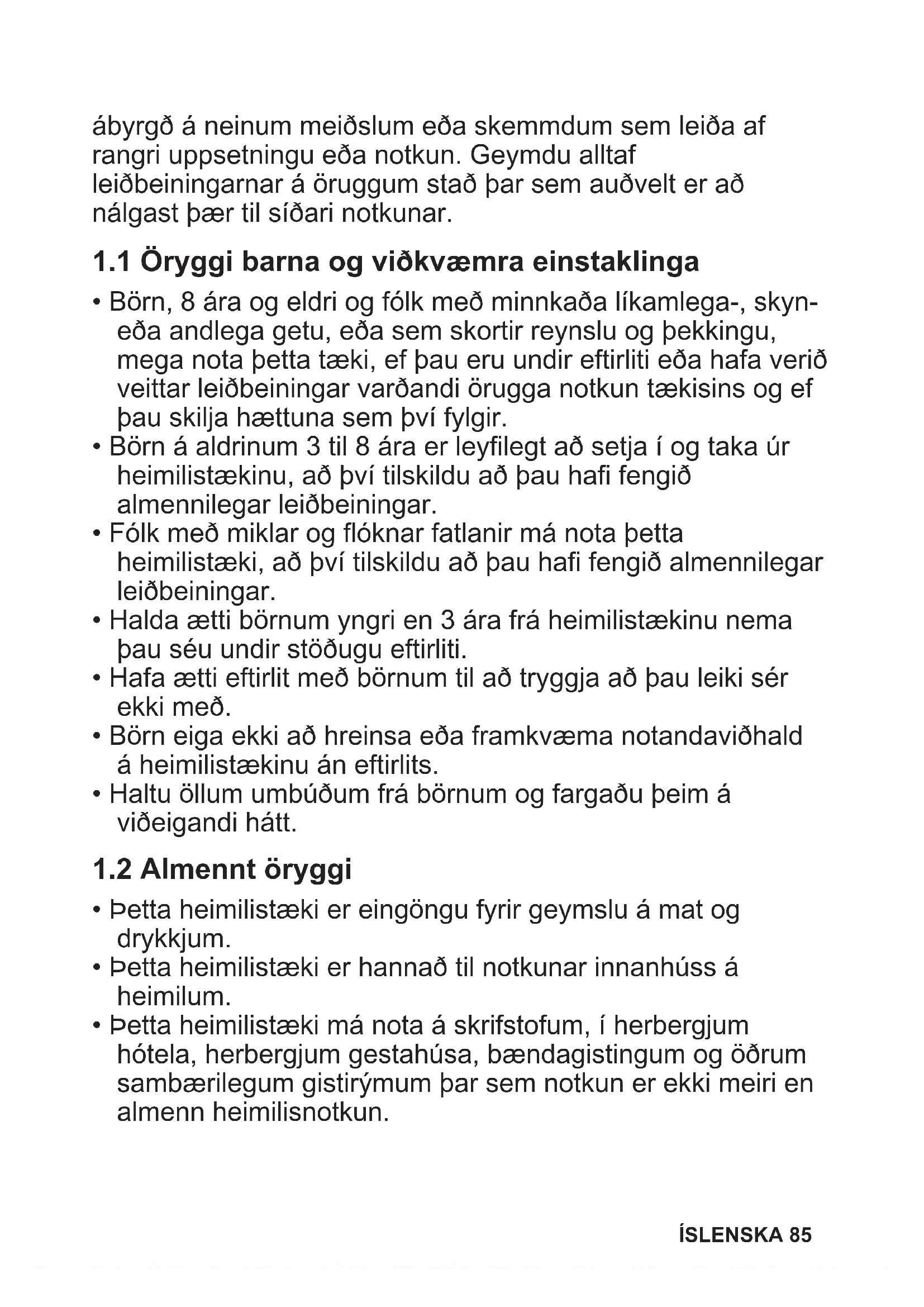 - Börn, 8 ára og eldri og fólk með minnkaða líkamlega-, skyn- eða andlega getu, eða sem skortir reynslu og þekkingu, mega nota þetta tæki, ef þau eru undir eftirliti eða hafa verið veittar leiðbeiningar varðandi örugga notkun tækisins og ef þau skilja hættuna sem því fylgir.