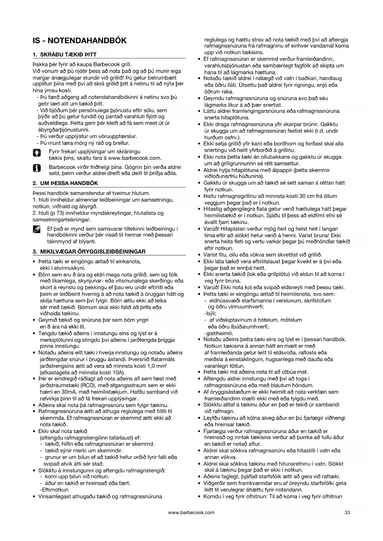 Þakka þér fyrir að kaupa Barbecook grill. Við vonum að þú njótir þess að nota það og að þú munir eiga margar ánægjulegar stundir við grillið! Þú getur betrumbætt upplifun þína með því að skrá grillið þitt á netinu til að nýta þér hina ýmsu kosti. - Þú færð aðgang að notendahandbókinni á netinu svo þú getir lært allt um tækið þitt. - Við bjóðum þér persónulega þjónustu eftir sölu, sem þýðir að þú getur fundið og pantað varahluti jótt og auðveldlega. Þetta gerir þér kleift að fá sem mest út úr ábyrgðarþjónustunni. - Þú verður upplýstur um vöruuppfærslur. - Þú munt læra mörg ný ráð og brellur. Fyrir frekari upplýsingar um skráningu tækis þíns, skaltu fara á www.barbecook.com. Barbecook virðir friðhelgi þína. Gögnin þín verða aldrei seld, þeim verður aldrei dreift eða deilt til þriðja aðila.