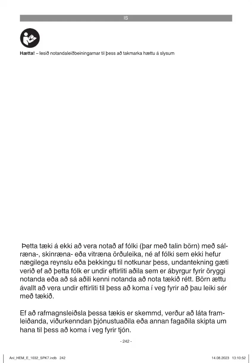 Hætta! – lesið notandaleiðbeiningarnar til þess að takmarka hættu á slysum Þetta tæki á ekki að vera notað af fólki (þar með talin börn) með sál- ræna-, skinræna- eða vitræna örðuleika, né af fólki sem ekki hefur nægilega reynslu eða þekkingu til notkunar þess, undantekning gæti verið ef að þetta fólk er undir eftirliti aðila sem er ábyrgur fyrir öryggi notanda eða að sá aðili kenni notanda að nota tækið rétt. Börn ættu ávallt að vera undir eftirliti til þess að koma í veg fyrir að þau leiki sér með tækið. Ef að rafmagnsleiðsla þessa tækis er skemmd, verður að láta fram- leiðanda, viðurkenndan þjónustuaðila eða annan fagaðila skipta um hana til þess að koma í veg fyrir tjón. Anl_HEM_E_1032_SPK7.indb 242Anl_HEM_E_1032_SPK7.indb 242 14.08.2023 13:10:5214.08.2023 13:10:52IS