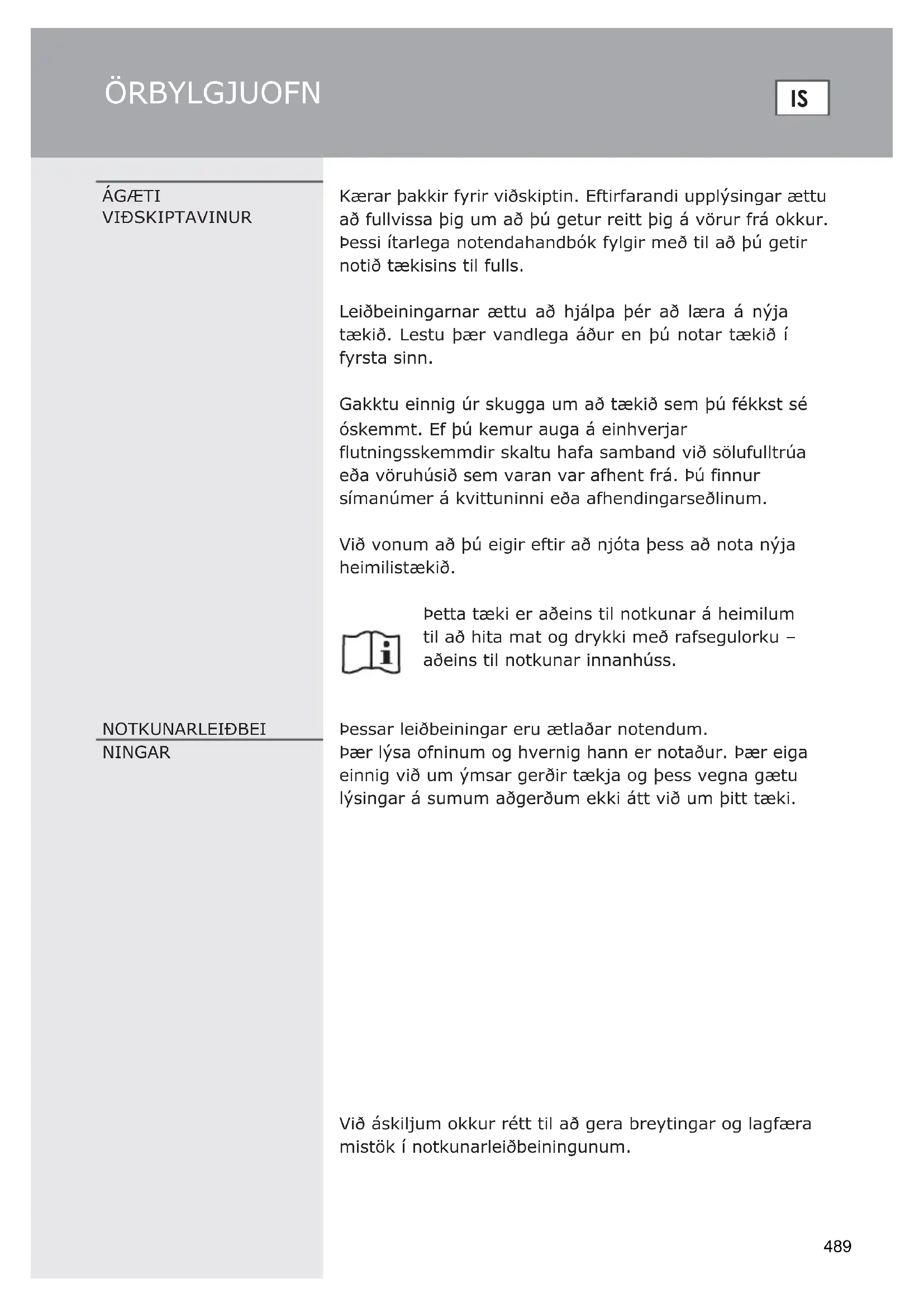 488ÖRBYLGJUOFN ÁGÆTI VIÐSKIPTAVINUR Kærar þakkir fyrir viðskiptin. Eftirfarandi upplýsingar ættu að fullvissa þig um að þú getur reitt þig á vörur frá okkur. Þessi ítarlega notendahandbók fylgir með til að þú getir notið tækisins til fulls. Leiðbeiningarnar ættu að hjálpa þér að læra á nýja tækið. Lestu þær vandlega áður en þú notar tækið í fyrsta sinn. Gakktu einnig úr skugga um að tækið sem þú fékkst sé óskemmt. Ef þú kemur auga á einhverjar flutningsskemmdir skaltu hafa samband við sölufulltrúa eða vöruhúsið sem varan var afhent frá. Þú finnur símanúmer á kvittuninni eða afhendingarseðlinum. Við vonum að þú eigir eftir að njóta þess að nota nýja heimilistækið. Þetta tæki er aðeins til notkunar á heimilum til að hita mat og drykki með rafsegulorku – aðeins til notkunar innanhúss. NOTKUNARLEIÐBEI NINGAR Þessar leiðbeiningar eru ætlaðar notendum. Þær lýsa ofninum og hvernig hann er notaður. Þær eiga einnig við um ýmsar gerðir tækja og þess vegna gætu lýsingar á sumum aðgerðum ekki átt við um þitt tæki. Við áskiljum okkur rétt til að gera breytingar og lagfæra mistök í notkunarleiðbeiningunum.