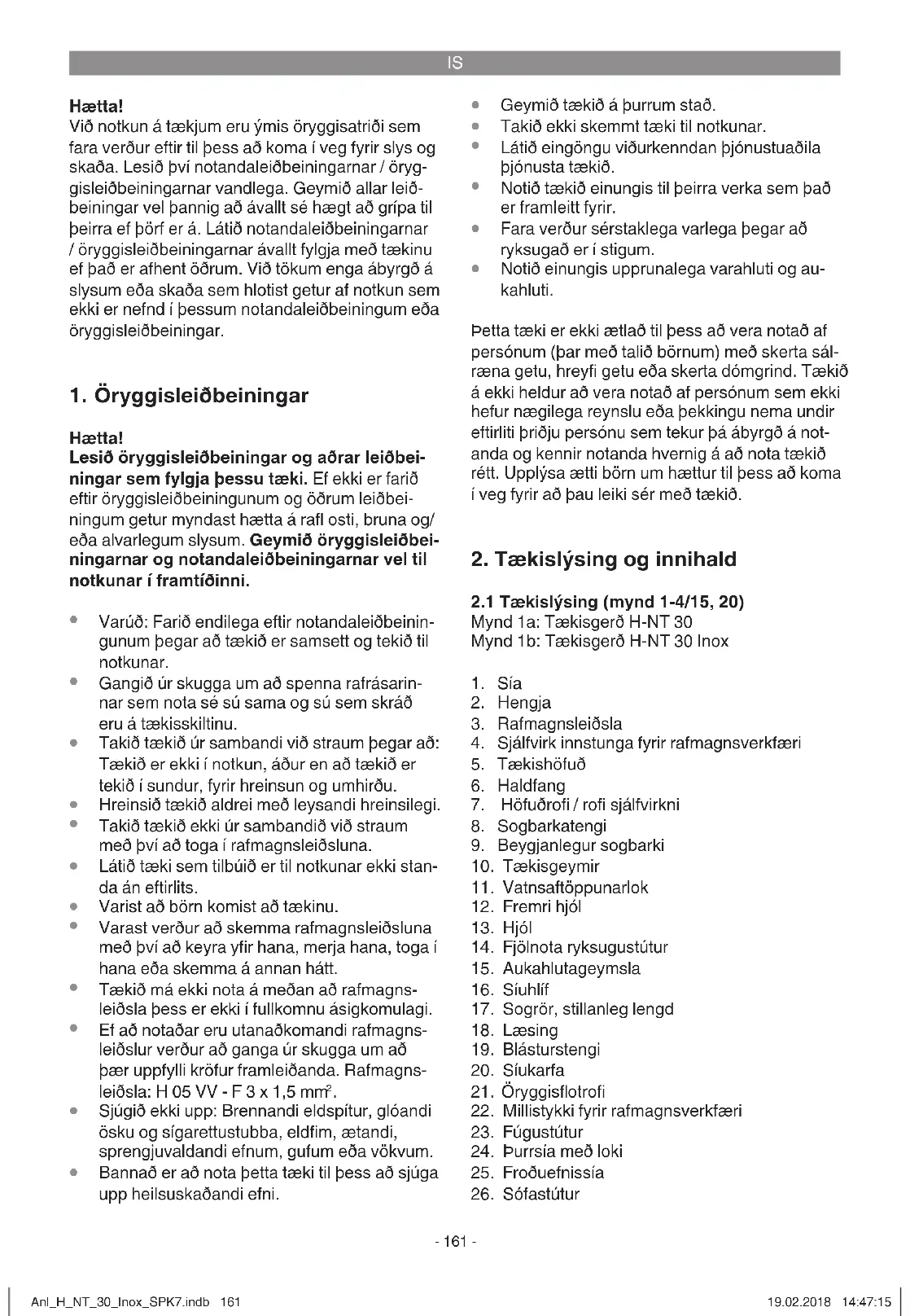 Sérstök skilyrði fyrir lönd Evrópubandalagsins: Kastið ekki notuðum rafmagnstækjum í vanalega ruslatunnu. Samkvæmt reglugerð fyrir Evrópu 2012/19/EU um gömul rafmangstæki og samkvæmt breytingum í lagasetningu hverrar þjóðar sambandsins verður að safna raftækjum aðskilið og koma fleim í sérstaka endurvinnslu í flágu umhverfi sverndar. Í staðinn fyrir að senda tækin til baka er eigandi þeirra hvattur til að vinna að því að rétt endurvinnsla eigi sér stað þegar hann afsalar sér tækinu sem eigandi. það er mögulegt að afhenda tækið til sérstakrar söfnunarstofnunar, sem sér um endurvinnslu tækisins samkvæmt lögum hinna ýmsu þjóða um endur- vinnslu og sorp. þetta á samt ekki við um viðbótarhluti, sem innihalda ekki rafmagnshluta. Eftirprentun eða önnur fjölprentun fylgiskjala og leiðarvísa vörunnar, líka í úrdrætti, er ekki leyfi leg nema grerinilegt samflykki frá iSC GmbH komi til. Það er áskilið að tæknilegar breytingar séu leyfi legar Anl_H_NT_30_Inox_SPK7.indb 166Anl_H_NT_30_Inox_SPK7.indb 166 19.02.2018 14:47:1519.02.2018 14:47:15IS