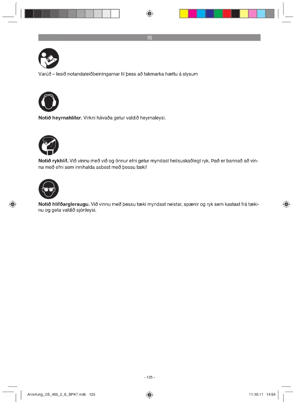Varúð – lesið notandaleiðbeiningarnar til þess að takmarka hættu á slysum Notið heyrnahlífar. Virkni hávaða getur valdið heyrnaleysi. Notið hlífðargleraugu. Við vinnu með þessu tæki myndast neistar, spænir og ryk sem kastast frá tæki- nu og geta valdið sjónleysi. Notið rykhlíf. Við vinnu með við og önnur efni getur myndast heilsuskaðlegt ryk. Það er bannað að vin- na með efni sem innihalda asbest með þessu tæki! Anleitung_DS_405_2_E_SPK7.indb 125Anleitung_DS_405_2_E_SPK7.indb 125 11.10.11 14:5411.10.11 14:54IS