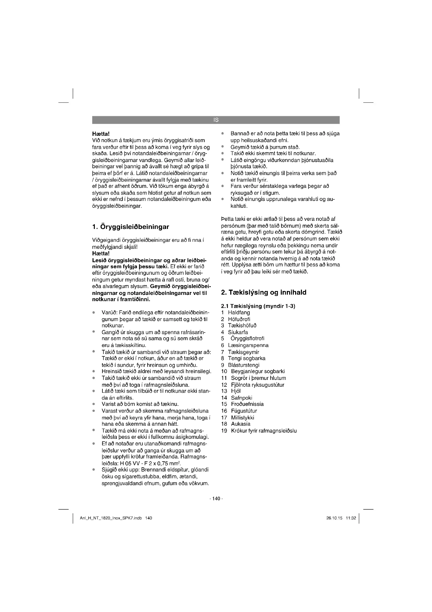 Viðgeigandi öryggisleiðbeiningar eru að fi nna í meðfylgjandi skjali! Hætta! Lesið öryggisleiðbeiningar og aðrar leiðbei- ningar sem fylgja þessu tæki. Ef ekki er farið eftir öryggisleiðbeiningunum og öðrum leiðbei- ningum getur myndast hætta á rafl osti, bruna og/ eða alvarlegum slysum. Geymið öryggisleiðbei- ningarnar og notandaleiðbeiningarnar vel til notkunar í framtíðinni.