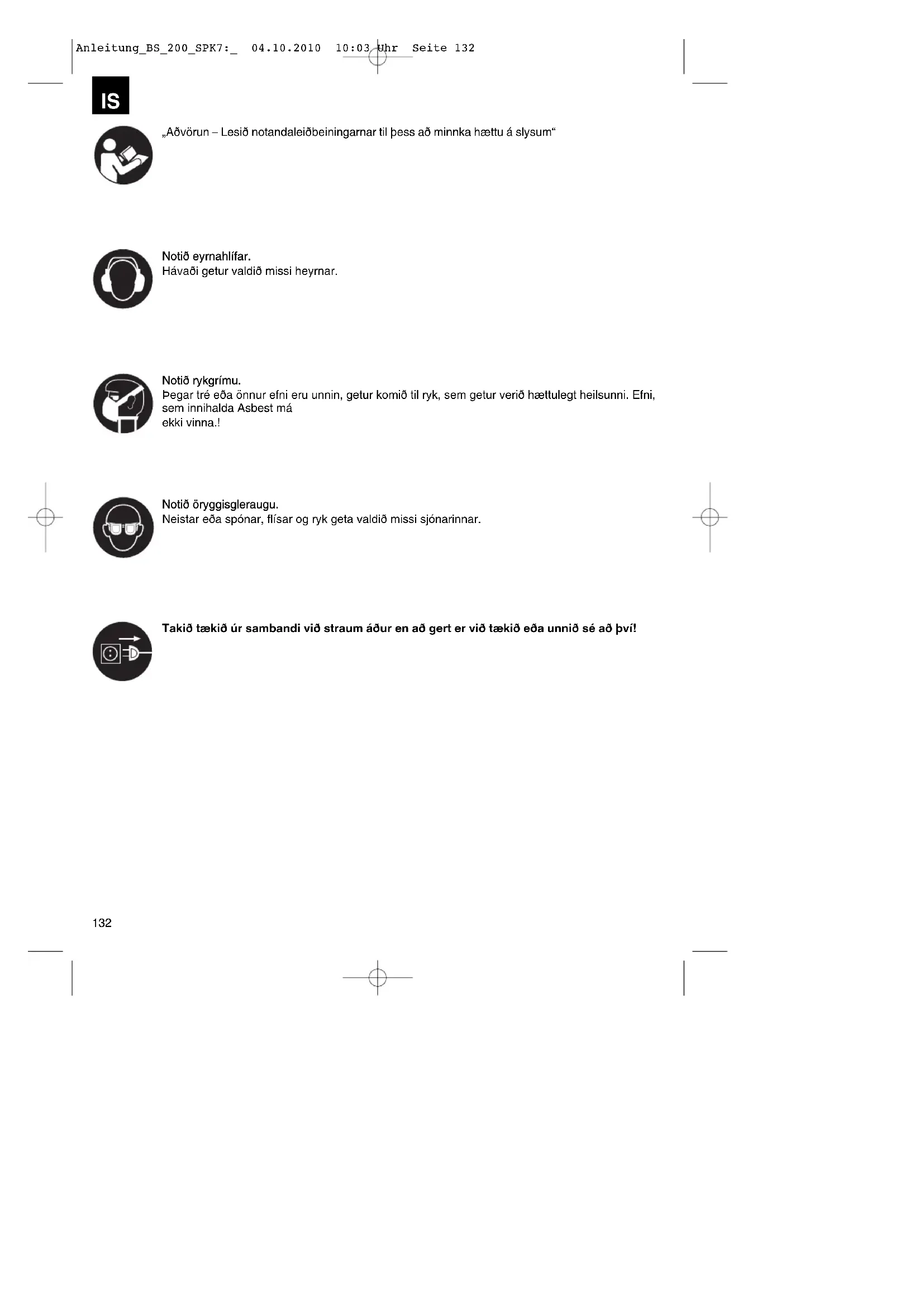 Takið tækið úr sambandi við straum áður en að gert er við tækið eða unnið sé að því! „Aðvörun – Lesið notandaleiðbeiningarnar til þess að minnka hættu á slysum“ Noti› eyrnahlífar. Háva›i getur valdi› missi heyrnar. Noti› rykgrímu. fiegar tré e›a önnur efni eru unnin, getur komi› til ryk, sem getur veri› hættulegt heilsunni. Efni, sem innihalda Asbest má ekki vinna.! Noti› öryggisgleraugu. Neistar e›a spónar, flísar og ryk geta valdi› missi sjónarinnar. Anleitung_BS_200_SPK7:_ 04.10.2010 10:03 Uhr Seite 132 Athugið! Við notkun tækja þarf að gera ákveðnar öryggisráðstafanir til að fyrirbyggja slys á fólki. Lesið þessar notkunarleiðbeiningar því vandlega. Geymið öryggisleiðbeiningarnar vel þannig að alltaf sé greiður aðgangur að þeim. Ef tækið er lánað skal sjá til þess að lántaki fái öryggisleiðbeiningarnar í hendur. Engin ábyrgð er tekin á slysum eða tjóni sem orsakast af því að ekki er farið eftir þessum leiðbeiningum og öryggisupplýsingum.