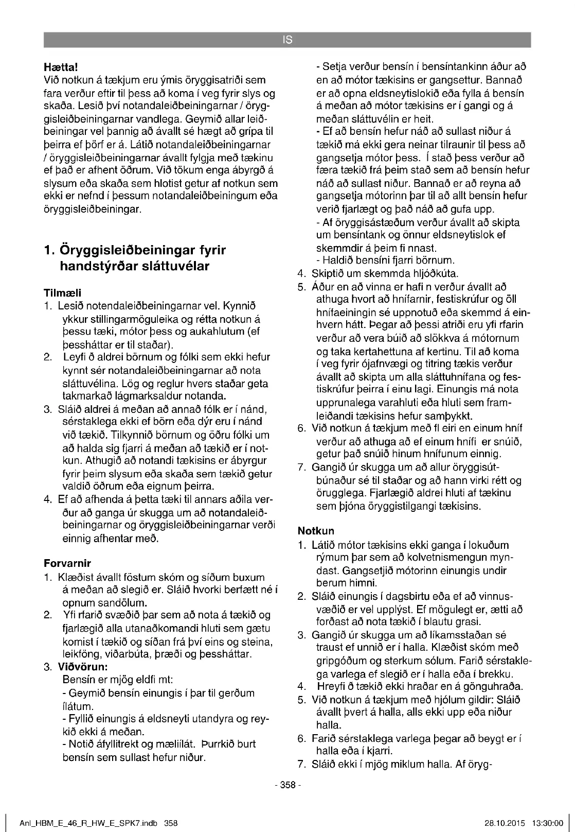 Varúðartilmæli: Slökkvið fyrst á mótor tækisins og takið kertahettuna af kertinu áður en að tækið er yfi r- farið eða stillingar á því eru framkvæmdar. Varúðartilmæli: Þegar að mótor tækisins hefur náð að ganga eftir stillivinnu, yfi rferð eða þessháttar verður að bera í huga að útblásturseining tækisins og aðrir hlutir eru heitir. Þess vegna á ekki að snerta þá hluti til þess að koma í veg fyrir brunaslys. Bilun Mögulegar ástæður Mögulegar ástæður Gangur óreglulegur, tæki titrað óeðlilega mikið - Lausar skrúfur - Hnífafestingar lausar - Hlífar eru úr jafnvægi - Yfi rfarið skrúfur - Yfi rfarið hnífafestingar - Skiptið um hníf Mótor gengur ekki - Mótorstart/mótorbremsu ekki haldið inni - Kerti er skemmt - Bensíntankur er tómur - Þrýstið inn mótorstart/mótorbremsu - Endurnýið kerti - Fyllið á bensín Mótor gengur óreg- lulega - Loftsía er óhrein - Kerti er óhreint - Hreinsið loftíu - Hreinsið kerti Grasfl öturinn verður gulur, Grasfl öturinn verður óreglulega sleginn - Hnífur er óbeittur - Sláttuhæð er of lítil - Brýnið hnífa - Stillið inn rétta sláttuhæð Grasútkast er óhreint - Sláttuhæð of lítil - Hnífar eru uppnotaðir - Safnpoki er stífl aður eða fullur - Stillið rétt - Skiptið um hníf - Tæmið safnpokann Rafgeymir hleðst ekki - Tenging á milli rafgeymis og tækis er ekki góð - Rafgeymirinn er skemmdur - Öryggi 5A (staða 19) hefur sprun- gið - Hreinsið tengifl eti - Látið fagaðila yfi rfara rafgeyminn og skiptið um hann ef þörf er á - Prufi ð að nota annan rafgeymi, skiptið um öryggi Startari snýst ekki - Rafgeymir er tómur - Rafgeymirinn er ekki tengdur - Tengi er ekki til staðar - Hlaðið rafgeyminn - Tengið rafgeyminn - Yfi rfarið tengið Anl_HBM_E_46_R_HW_E_SPK7.indb 371Anl_HBM_E_46_R_HW_E_SPK7.indb 371 28.10.2015 13:30:0128.10.2015 13:30:01IS