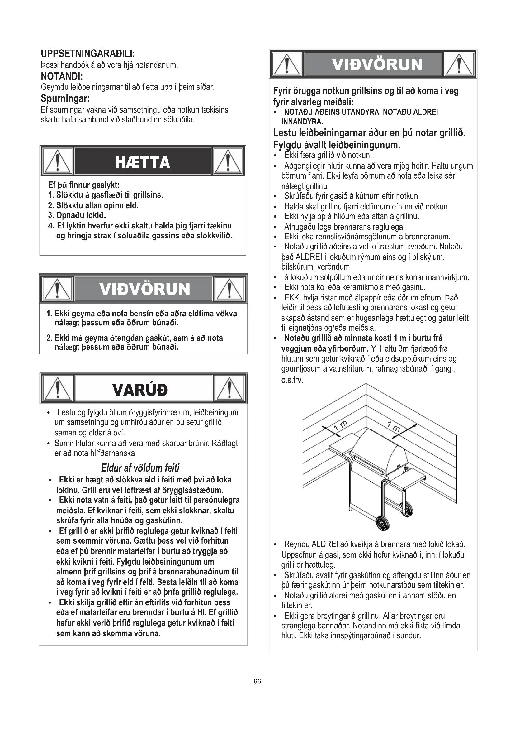 nálægt þessum eða öðrum búnaði. VARÚÐ Ÿ Lestu og fylgdu öllum öryggisfyrirmælum, leiðbeiningumum samsetningu og umhirðu áður en þú setur grilliðsaman og eldar á því. Ÿ Sumir hlutar kunna að vera með skarpar brúnir. Ráðlagt er að nota hlífðarhanska. Eldur af völdum feiti Ÿ Ekki er hægt að slökkva eld í feiti með því að lokalokinu. Grill eru vel loftræst af öryggisástæðum.Ÿ Ekki nota vatn á feiti, það getur leitt til persónulegrameiðsla. Ef kviknar í feiti, sem ekki slokknar, skaltuskrúfa fyrir alla hnúða og gaskútinn.Ÿ Ef grillið er ekki þrifið reglulega getur kviknað í feitisem skemmir vöruna. Gættu þess vel við forhituneða ef þú brennir matarleifar í burtu að tryggja aðekki kvikni í feiti. Fylgdu leiðbeiningunum umalmenn þrif grillsins og þrif á brennarabúnaðinum tilað koma í veg fyrir eld í feiti. Besta leiðin til að komaí veg fyrir að kvikni í feiti er að þrífa grillið reglulega.Ÿ Ekki skilja grillið eftir án eftirlits við forhitun þesseða ef matarleifar eru brenndar í burtu á HI. Ef grilliðhefur ekki verið þrifið reglulega getur kviknað í feitisem kann að skemma vöruna.