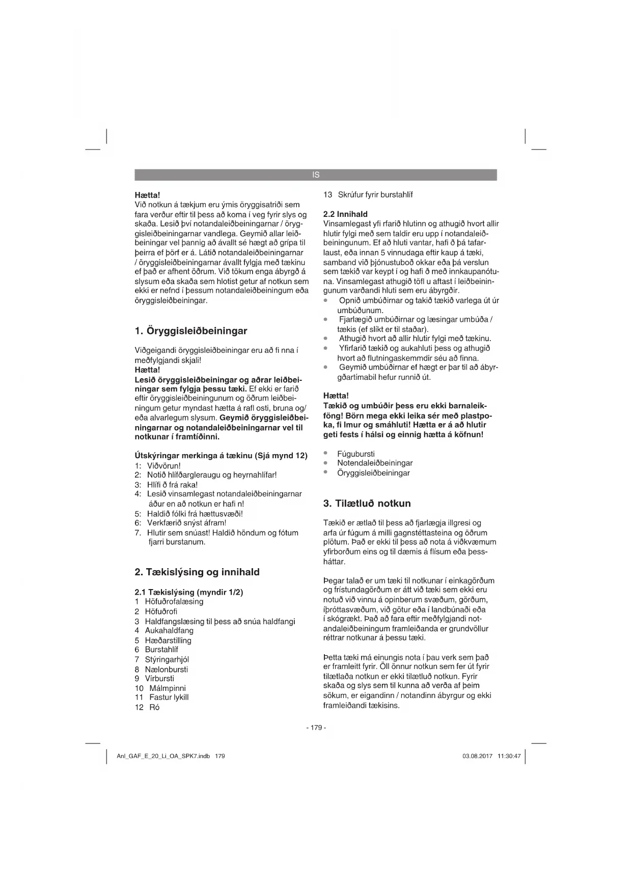 Til þess að slökkva á sláttuorfinu, sleppið þá höfuðrofanum aftur (mynd 2 / staða 2). Fylgjandi með tækinu er að fi nna einn stálbursta (mynd 2 / staða 9) og einn nælonbursta (mynd 2 / staða 8). Þegar að yfi rborðið er ekki viðkvæmt og þar sem gróðurinn situr mjög fastur er mælt með að nota stálburstann. Þegar að yfi rborðið er of viðkvæmt til þess að nota stálbursta eða þar sem gróðurinn er lausari ætti að nota nælonburstann. Anl_GAF_E_20_Li_OA_SPK7.indb 181Anl_GAF_E_20_Li_OA_SPK7.indb 181 03.08.2017 11:30:4703.08.2017 11:30:47IS