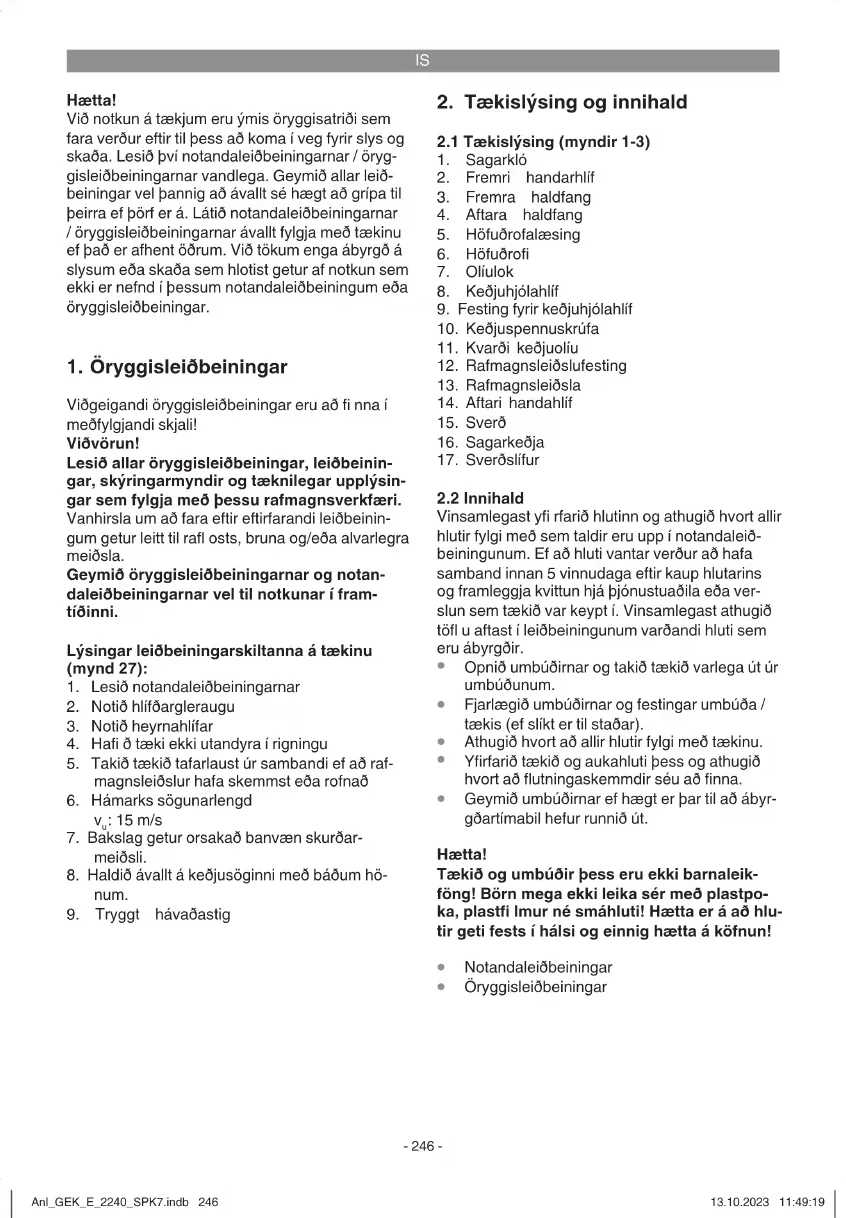 Yfi rfarið eftirfarandi atriði fyrir hverja notkun til þess að tryggja örugga vinnu: Ástand keðjusagarinnar Yfi rfarið keðjusögina fyrir notkun hennar og gan- gið úr skugga um að tækishús, rafmagnsleiðslur, sagarkeðja og sverð sé í góðu lagi. Takið tækið aldrei til notkunar ef að það er skemmt. Olíugeymir Olíumagn olíugeymis. Athugið einnig hvort að næ- gileg olía er til staðar á meðan að vinnu stendur. Notið sögina aldrei, ef að það er ekki olía á henni eða þegar að yfi rborð olíu er undir lágmarki (mynd 10 / staða B) til þess að koma í veg fyrir skemmdir á sagarkeðjunni. Ein fylling dugar að meðaltali í 15 mínútur, sem fer einnig eftir hléum og álagi. Sagarkeðja Spenna sagarkeðju, ástand keðju. Eftir því sem að sagarkeðjan er beittari er vinnan auðveldari og betra er að stjórna henni. Það sama á við um spennu sagarkeðjunnar. Yfi rfarið einnig spennu sagarkeðjunnar við vinnu á 10 mínútna millibili til þess að auka eigið öryggi. Nýjar keðjur þenjast sérstaklega mikið. Keðjubremsa Prufi ð virkni keðjubremsunnar eins og lýst er í kaf- lanum „Öryggisútbúnaður“ og losið hana. Vinnuklæðnaður Klæðist ávallt viðeigandi klæðnaðar, ekki of víðum vinnuklæðnaði, vinnuvettlingum og öryggisskóm. Heyrnahlífar og hlífðargleraugu. Notið ávallt öryggishjálm með innbyggðum heyr- nar- og andlitshlíf þegar að tré eru felld. Þessi búnaður hlífi r notanda fyrir fallandi greinum og Anl_GEK_E_2240_SPK7.indb 249Anl_GEK_E_2240_SPK7.indb 249 13.10.2023 11:49:2013.10.2023 11:49:20IS