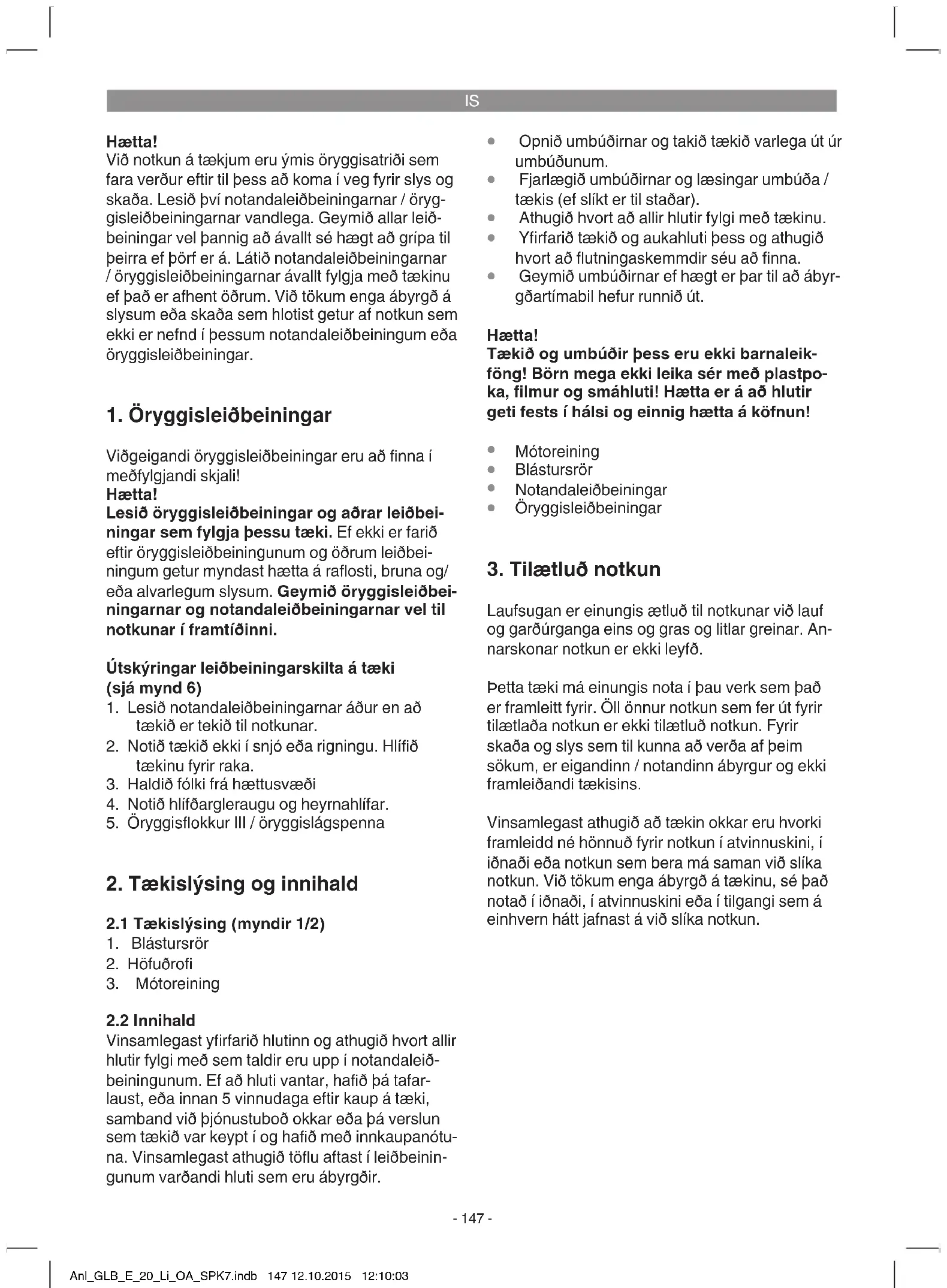 Laufsugan er einungis ætluð til notkunar við lauf og garðúrganga eins og gras og litlar greinar. An- narskonar notkun er ekki leyfð. Þetta tæki má einungis nota í þau verk sem það er framleitt fyrir. Öll önnur notkun sem fer út fyrir tilætlaða notkun er ekki tilætluð notkun. Fyrir skaða og slys sem til kunna að verða af þeim sökum, er eigandinn / notandinn ábyrgur og ekki framleiðandi tækisins. Vinsamlegast athugið að tækin okkar eru hvorki framleidd né hönnuð fyrir notkun í atvinnuskini, í iðnaði eða notkun sem bera má saman við slíka notkun. Við tökum enga ábyrgð á tækinu, sé það notað í iðnaði, í atvinnuskini eða í tilgangi sem á einhvern hátt jafnast á við slíka notkun. Anl_GLB_E_20_Li_OA_SPK7.indb 147 12.10.2015 12:10:03IS