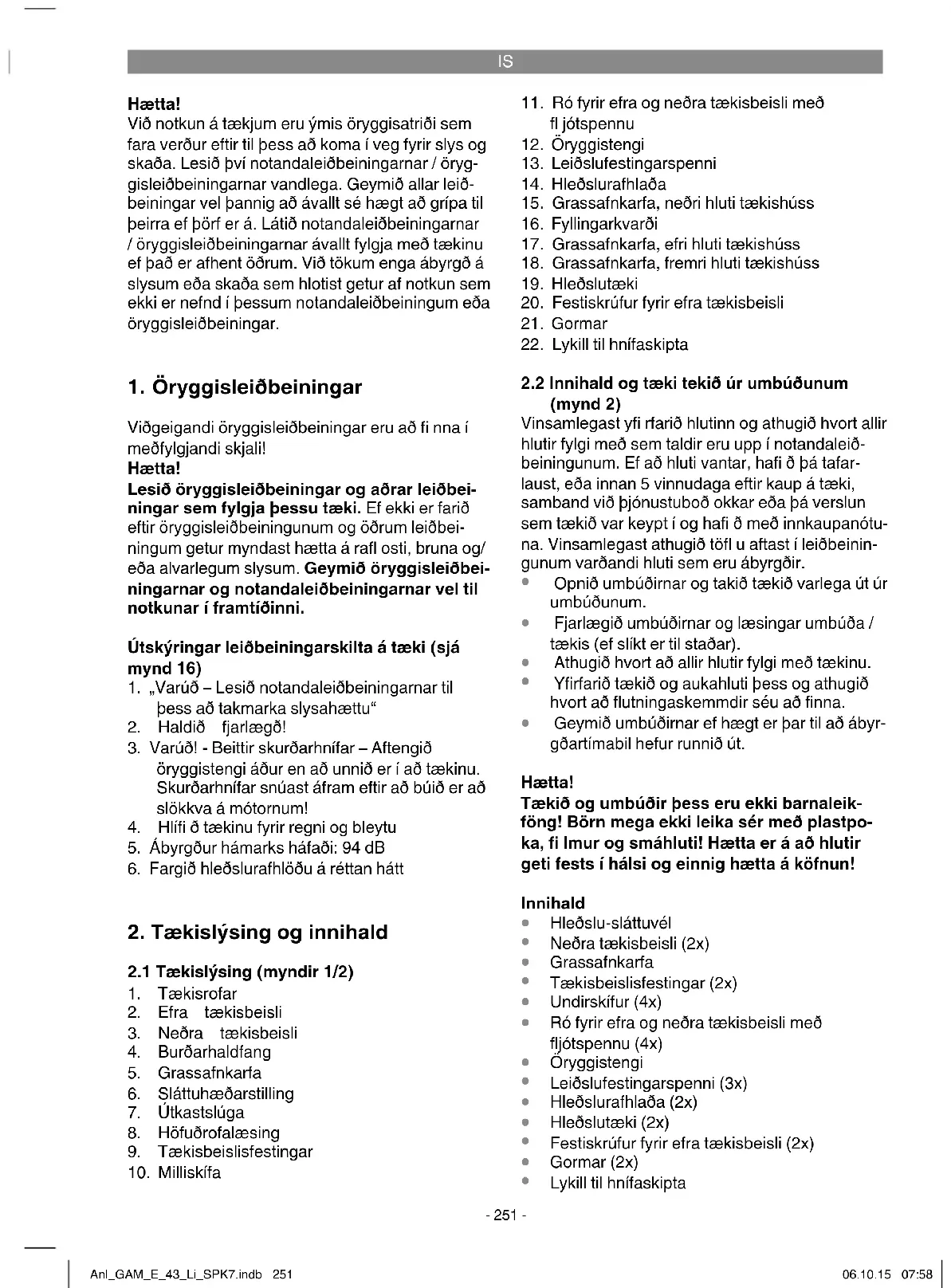 en að viðgerðir eða viðhald er hafi ð á þessu tæki verður ávallt að ganga úr skugga um að hnífaei- ningin sé ekki á snúningi og að búið sé að fjar- lægja öryggistengið úr tækinu. Viðvörun! Opnið aldrei útkastlúgu þegar að losa á safnpoka á meðan að mótor tækisins er í gangi. Hnífar á snúningi geta valdið sly- sum. Festið útkastslúguna eða safnkörfuna ávalt vel. Slökkvið ávallt á mótor tækisins áður en að þessir hlutir eru fjarlægðir. Haldið ávallt öruggu millibili sem stýribeisli gefur á milli sláttuhús og notanda. Fara verður sérstak- lega varlega þegar að snúið er við eða þegar að slegið er í kringum hluti eða runna. Athugið að stand notanda sé ávallt traust og notið gripgóðan og traustan skóbúnað og síðar buxur. Sláið ávallt þvert á halla. Af öryggisástæðum er bannað að slá í halla sem er yfi r 15 gráður með þessari sláttuvél. Farið sérstaklega varlega þegar að sláttuvélin er dregin afturábak í átt að notandanum. Hætta á að detta! Leiðbeiningar fyrir rétta sláttuvinnu Þegar að unnið er með þessari sláttuvél er mælt með því að leiðirnar fari að hluta yfi r hverja aðra. Sláið einungis með beittum og óskemmdum hnífum, þá verður grasið skorið án þess að merja það og fl öturinn verður síður gulur. Til þess að tryggja sem bestan skurð á grasinu ætti að halda leiðum sláttar beinum. Sláttuleiðir- nar ættu að leggjast yfi r hverja aðra um nokkra sentímetra þannig að ekki verðir óslegin hluti eftir. Hversu oft á að slá fer háð því hversu hratt grasið vex. Á aðal vaxtatíma (Maí – Júní) tvisvar í viku annar einu sinni í viku. Sláttuhæð ætti að vera á bilinu 4 – 6 cm og leifa síðan að vaxa 4 – 5 cm áður en að slegið er aftur. Ef að grasið hefur náð að vaxa meira ein vanalega ætti að forðast þau mistök að slá hann strax niður í venjulega hæð. Það skemmir grasið. Sláið ekki meira en hálfa grasengd. Haldið neðri hluta sláttuvélarinnar ávallt hreinum og fjarlægið grasrestar sem safnast saman þar. Uppsafnaðar grasrestar gera gangsetningu á tæki erfi ðari, gera slátt verri og takmarka útkastgetu grass. Ef slegið er í halla á ávallt að slá þvert á hann. Ef sláttuvélinni er beint á ská uppávið, kemur það í veg fyrir að hún renni niður. Stillið inn sláttuhæð eftir lengd grass. Sláið oftar yfi r fl ötinn þannig að einungis séum slegnir hámarks 4cm af grasi í einu. Slökkva verður á mótornum áður en að tækið er yfi rfarið á einhvern hátt. Athugið að hnífar tæki- sins snúast í nokkrar sekúndur eftir að búið er að slökkva á mótor þess. Reynið aldrei að stöðva hnífa þessa tækis. Athugið reglulega hvort að hnífurinn sé vel festur, að hann sé í góðu ásigko- mulagi og að hann sé beittur. Ef svo er ekki verður að skipta um þá eða brýna. Ef að hnífurinn sem er á hreyfi ngu kemst í snertingu við einhvern hlut, stöðvið þá sláttuvélina og bíðið þar til að hnífurinn hefur náð að stöðvast fullkomlega. Yfi rfarið eftir það hníf og festingu hans. Ef að skemmdir eru að fi nna verður að skipta um hann. Um leið og að tekið er eftir að grasrestar verða eftir á fl etinum ætti að tæma safnkörfuna. Varúð! Áður en að safnkarfan er fjarlæg verður að ganga úr skugga um að búið sé að slökkva á mótornum og bíða þar til að hann hefur náð að stöðvast full- komlega. Til þess að fjarlægja safnkörfuna verður að lyfta upp lúfunni með einni hendi og taka í burtu saf- nkörfuna með haldfanginu með hinni hendinni. Af öryggisástæðum fellur lúfan aftur niður þegar að safnkarfan hefur verið fjarlægð og lokar aftara útkastsopinu. Ef að grasrestar varða eftir í opinu ætti að draga sláttuvélina um það bil 1 metra afturábak til þess að auðvelda gangsetningu. Grasrestar í sláttuhúsi og á skurðareiningu ætti ekki að fjarlægja með höndum eða fótum heldur ætti ávallt að notast við viðeigandi verkfæri eins og til dæmis bursta eða handkúst. Til þess að tryggja að gras sé safnað vel saman við sláttur verður að ganga úr skugga um að hreinsa grassafnkörfuna eftir notkun. Fjarlægið einungis safngrindina á meðan að mó- tor tækisins hefur verið stöðvaður og bíðið þar til að hnífarnir hafa náð að stöðvast fullkomlega. Lyftið upp útkastlúfu með einni hend og setjið safnkörfuna á sinn stað með hinni hendinni að ofanverðu. Anl_GAM_E_43_Li_SPK7.indb 255Anl_GAM_E_43_Li_SPK7.indb 255 06.10.15 07:5806.10.15 07:58IS