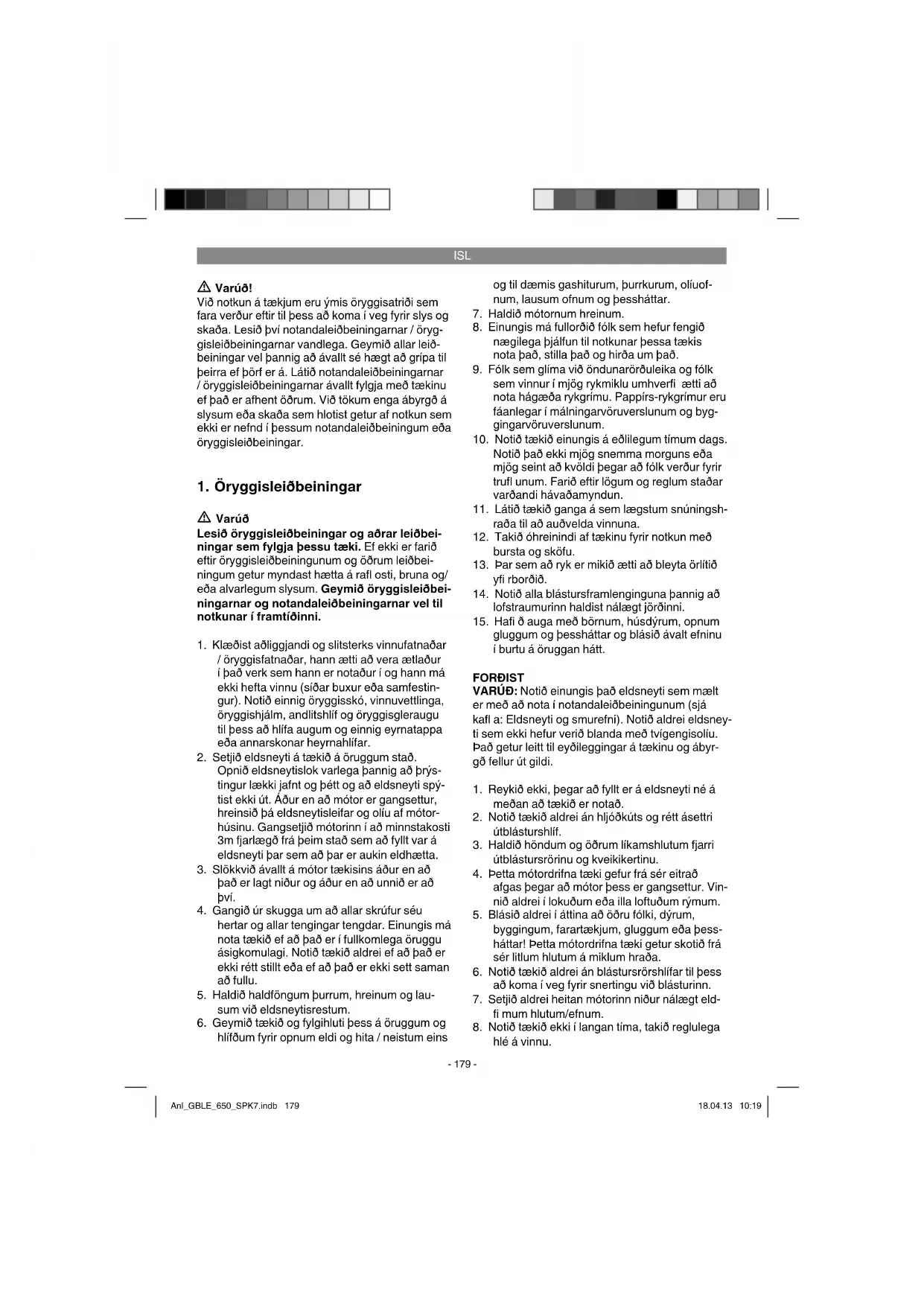 Laufsugan/ -blásarinn er einungis ætlaður til notkunar við lauf og garðúrganga eins og gras og litlar greinar. Annarskonar notkun er ekki leyfð. Þetta tæki má einungis nota í þau verk sem það er framleitt fyrir. Öll önnur notkun sem fer út fyrir tilætlaða notkun er ekki tilætluð notkun. Fyrir skaða og slys sem til kunna að verða af þeim sökum, er eigandinn / notandinn ábyrgur og ekki framleiðandi tækisins. Vinsamlegast athugið að tækin okkar eru hvorki framleidd né hönnuð fyrir notkun í atvinnuskini, í iðnaði eða notkun sem bera má saman við slíka notkun. Við tökum enga ábyrgð á tækinu, sé það Anl_GBLE_650_SPK7.indb 180Anl_GBLE_650_SPK7.indb 180 18.04.13 10:1918.04.13 10:19ISL