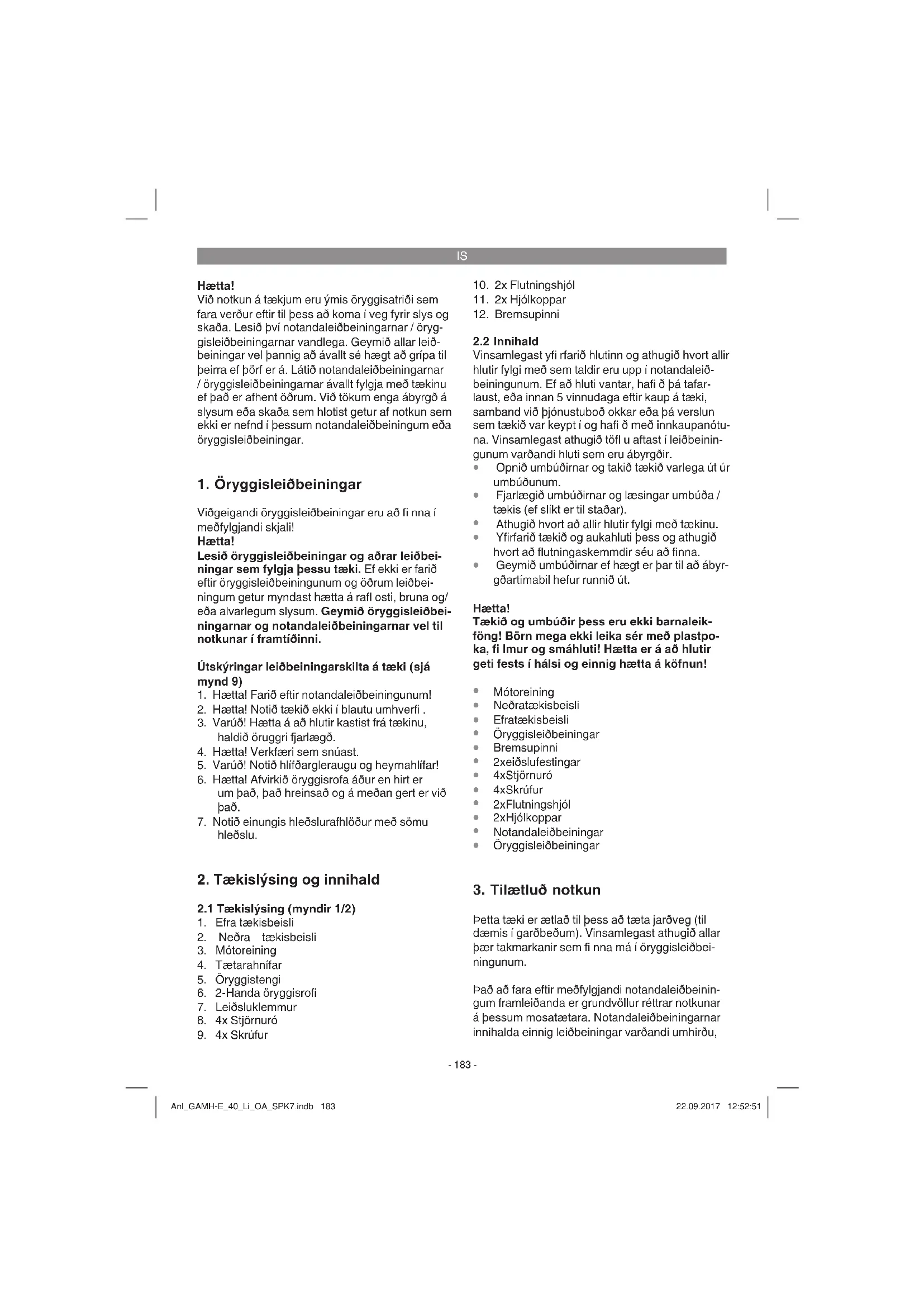 Þetta tæki er ætlað til þess að tæta jarðveg (til dæmis í garðbeðum). Vinsamlegast athugið allar þær takmarkanir sem fi nna má í öryggisleiðbei- ningunum. Það að fara eftir meðfylgjandi notandaleiðbeinin- gum framleiðanda er grundvöllur réttrar notkunar á þessum mosatætara. Notandaleiðbeiningarnar innihalda einnig leiðbeiningar varðandi umhirðu, Anl_GAMH-E_40_Li_OA_SPK7.indb 183Anl_GAMH-E_40_Li_OA_SPK7.indb 183 22.09.2017 12:52:5122.09.2017 12:52:51IS
