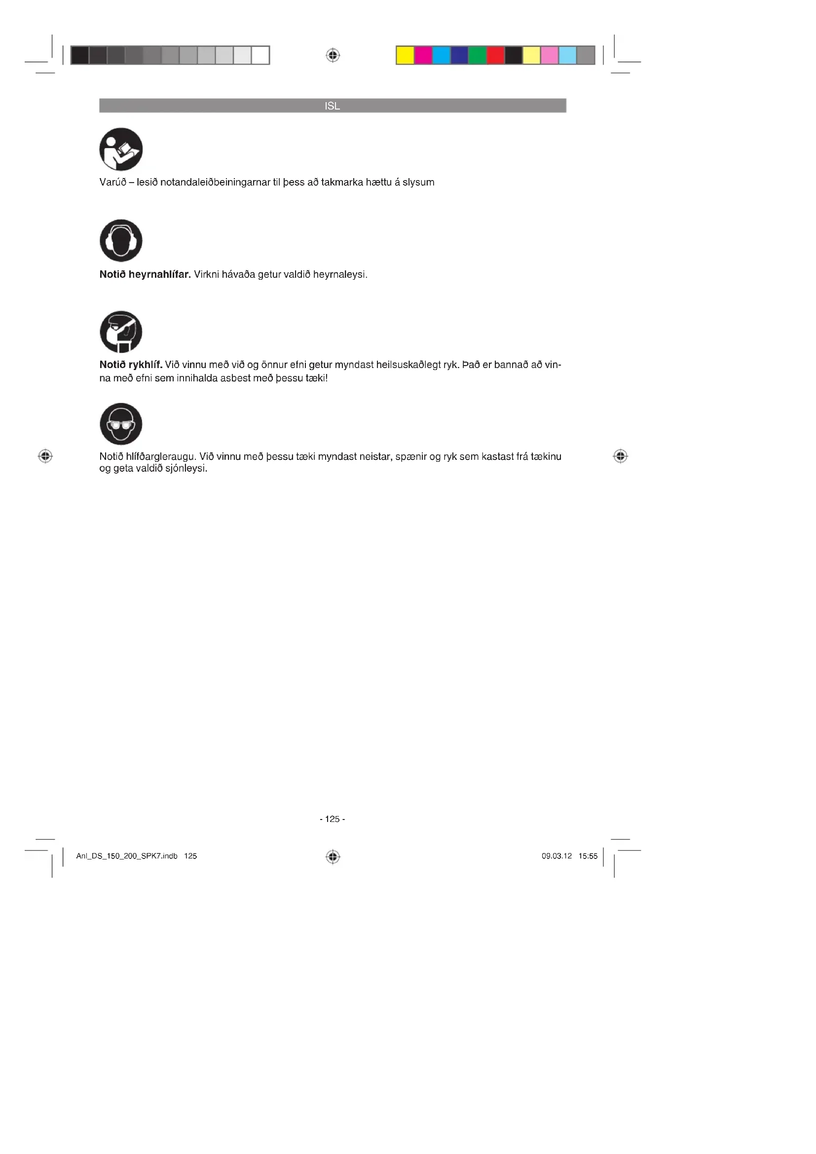 Varúð – lesið notandaleiðbeiningarnar til þess að takmarka hættu á slysum Notið heyrnahlífar. Virkni hávaða getur valdið heyrnaleysi. Notið hlífðargleraugu. Við vinnu með þessu tæki myndast neistar, spænir og ryk sem kastast frá tækinu og geta valdið sjónleysi. Notið rykhlíf. Við vinnu með við og önnur efni getur myndast heilsuskaðlegt ryk. Það er bannað að vin- na með efni sem innihalda asbest með þessu tæki! Anl_DS_150_200_SPK7.indb 125Anl_DS_150_200_SPK7.indb 125 09.03.12 15:5509.03.12 15:55ISL
