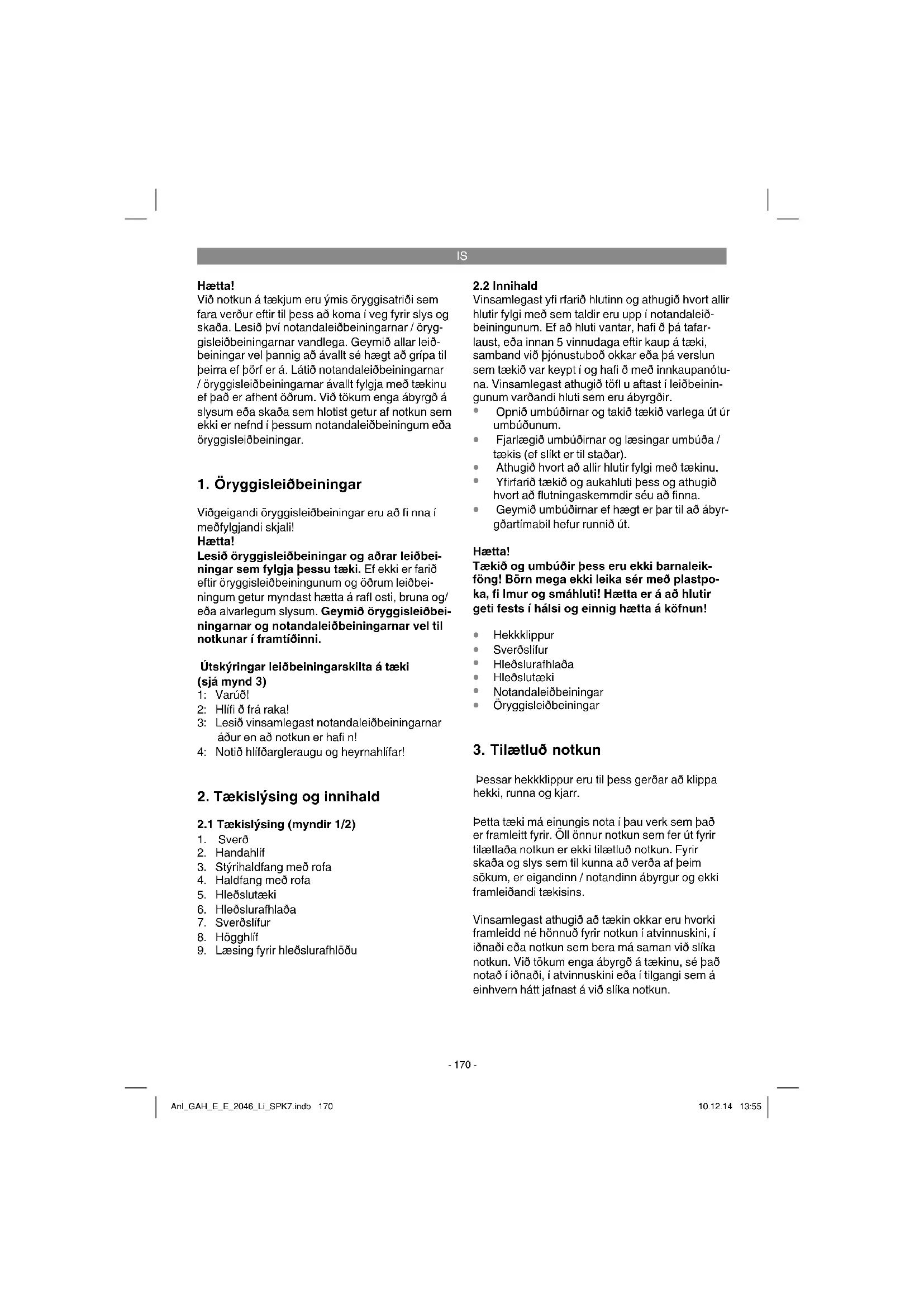 og hleðslurafhlöðuna til þjónustuverkstæðis okkar. Til að tryggja langan líftíma hleðslurafhlöðunnar ætti að ganga úr skugga um að hleðslurafhlaðan sé hlaðin reglulega. Það er í síðasta lagi nauð- synlegt ef að tekið er eftir því að kraftur Hleðslu- hekkklippnanna er farinn að minka. Tæmið hleðslurafhlöðu hekkklippunnar aldrei full- komlega. Það skemmir hleðslurafhlöðuna. Anl_GAH_E_E_2046_Li_SPK7.indb 171Anl_GAH_E_E_2046_Li_SPK7.indb 171 10.12.14 13:5510.12.14 13:55IS