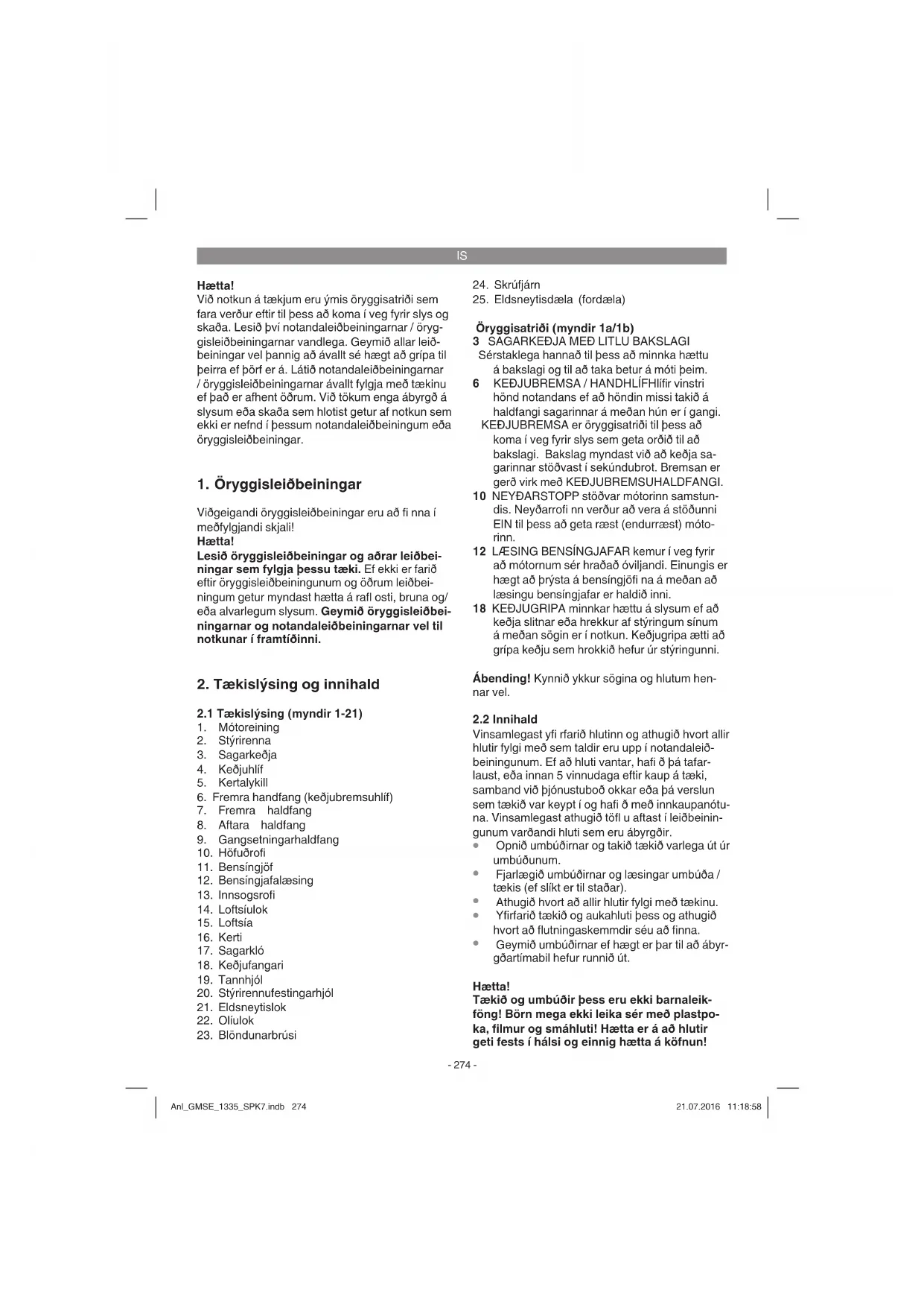 Vandamál Möguleg ástæða Lausn Mótor fer ekki í gang, eða fer í gang en gengur ekki. - Gangsetning ekki rétt framkvæmd. - Of mikið eldsneyti í brennslurími vegna gangsetningar sem ekki he- fur virkað. - Blöndungur ekki rétt stilltur. - Upptært kerti. - Bensínsía stífl uð. - Farið eftir leiðbeiningunum í þes- sum notandaleiðbeiningum. - Bíðið í um það bil 30 mínútur þar til að eldsneytið í brennsluríminu hefur gufað upp áður en að reynt er að gangsetja tækið að nýju. - Látið viðurkenndan þjónustuaðila stilla blöndunginn. - Hreinsið kertið / stillið kertamillibil eða skiptið um kerti. - Skiptið um bensínsíu. Mótor fer í gang en skilar ekki fullu afl i. - Röng staða innsogsrofa. - Loftsía er stífl uð - Blöndungsstilling ekki rétt. - Setjið rofann í rétta stöðu. - Fjarlægið síu, hreinsið hana og set- jið hana aftur í tækið. - Látið viðurkenndan þjónustuaðila stilla blöndunginn. Mótor koðnar - Blöndungur ekki rétt stilltu - Látið viðurkenndan þjónustuaðila stilla blöndunginn Lítill kraftur undir álagi - Kveikikerti ekki rétt stillt - Hreinsið kveikikertið / skiptið um kveikikerti Mótor gengur óreg- lulega - Blöndungur ekki rétt stilltu - Látið viðurkenndan þjónustuaðila stilla blöndunginn Mikil reykmyndun - Röng eldsneytisblanda - Notið rétta eldsneytisblöndu (hlut- fallið 40:1) Eingin kraftur við átak - Keðja óbeitt - Keðja ekki nægilega spennt - Slípið keðjuna eða setjið nýja keðju á sögina - Spennið hana Mótor drepur á sér - Bensíntankur er tómur - Bensínsía er ekki á sínum stað - Fyllið bensíntankinn - Fyllið bensíntankinn alveg eða set- jið bensínsíuna á réttan stað Keðjusmurning ekki nægilega mikil (Sverð og keðja hitna) - Keðjuolíugeymir er tómur - Smurningsop eru stífl uð - Fyllið á keðjuolíugeymi - Hreinsið smurningsop / keðjus- týringarrennu Eftirprentun eða önnur fjölprentun fylgiskjala og leiðarvísa vörunnar, líka í úrdrætti, er ekki leyfi leg nema grerinilegt samflykki frá iSC GmbH komi til. Það er áskilið að tæknilegar breytingar séu leyfi legar Anl_GMSE_1335_SPK7.indb 284Anl_GMSE_1335_SPK7.indb 284 21.07.2016 11:18:5921.07.2016 11:18:59ISL