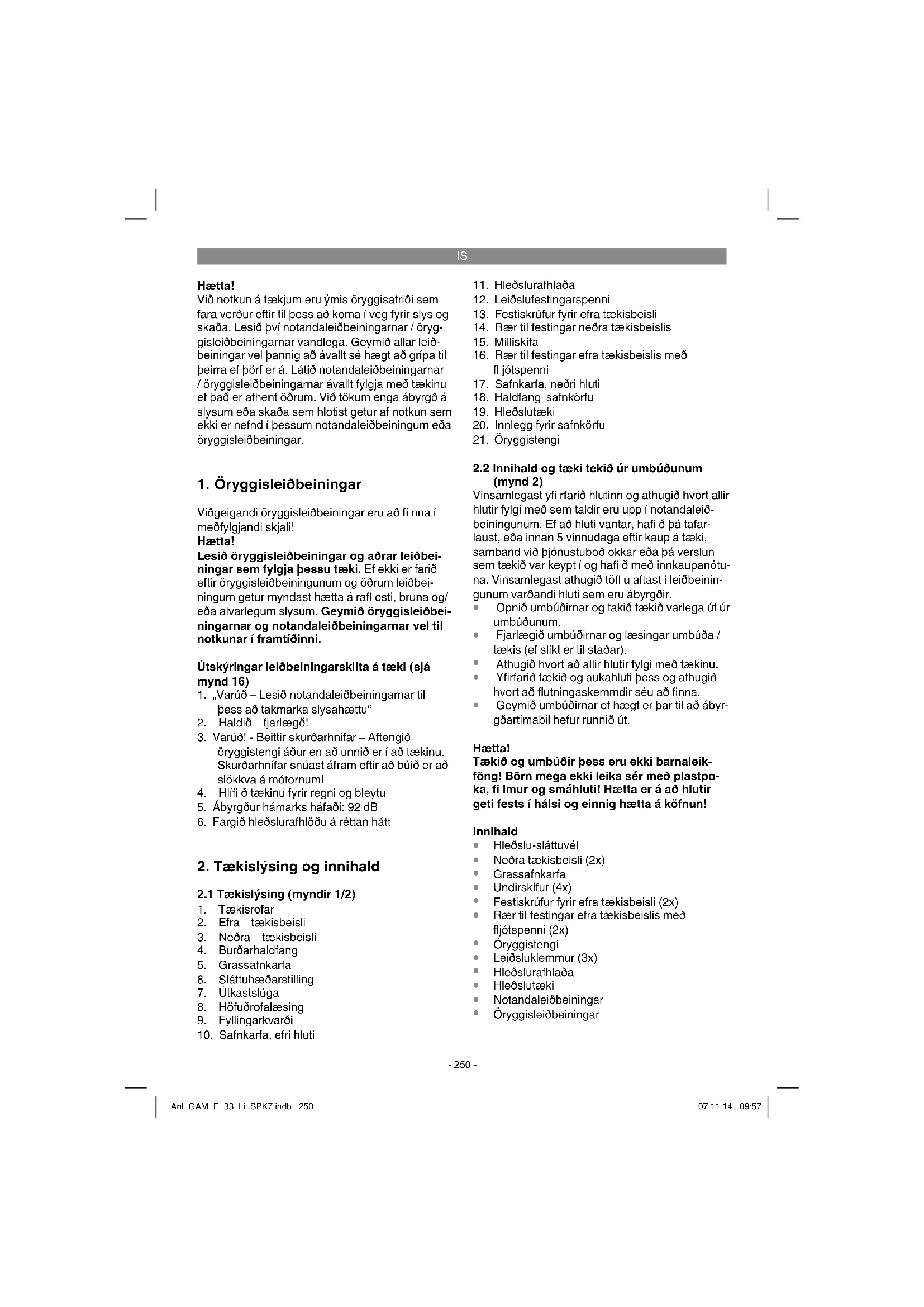 Varúð! Sláttuvélin er útbúin öryggistengi til þess að koma í veg fyrir að hún sé notuð af utanaðkomandi. Setjið öryggistengið (mynd 13) í sláttuvélina rétt áður en að hún er tekin til notkunar og fjarlægið það aftur þegar að hlé er tekið á vinnu eða þegar að vinnu er lokið. Varúð! Til þess að koma í veg fyrir að tækið hrökkvi óviljandi í gang, er sláttuvélin útbúin öryggisrofa (mynd 4 / staða 8) sem verður að vera haldið inni áður en að hægt er að þrýsta inn gangsetnin- garrofanum (mynd 4 / staða 1). Ef að rofunum er sleppt, slekkur sláttuválin á sér. Gerið þetta nok- krum sinnum þannig að þú sért viss um að tækið virki rétt. Áður en að viðgerðir eða viðhald er hafi ð á þessu tæki verður ávallt að ganga úr skugga um að hnífaeiningin sé ekki á snúningi og að búið sé að fjarlægja öryggistengið úr tækinu. Viðvörun! Opnið aldrei útkastlúgu þegar að losa á safnpoka á meðan að mótor tækisins er í gangi. Hnífar á snúningi geta valdið sly- sum. Festið útkastslúguna eða safnkörfuna ávalt vel. Slökkvið ávallt á mótor tækisins áður en að þessir hlutir eru fjarlægðir. Haldið ávallt öruggu millibili sem stýribeisli gefur á milli sláttuhús og notanda. Fara verður sérstak- lega varlega þegar að snúið er við eða þegar að slegið er í kringum hluti eða runna. Athugið að stand notanda sé ávallt traust og notið gripgóðan og traustan skóbúnað og síðar buxur. Sláið ávallt þvert á halla. Af öryggisástæðum er bannað að slá í halla sem er yfi r 15 gráður með þessari sláttuvél. Farið sérstaklega varlega þegar að sláttuvélin er dregin afturábak í átt að notandanum. Hætta á að detta! Anl_GAM_E_33_Li_SPK7.indb 253Anl_GAM_E_33_Li_SPK7.indb 253 07.11.14 09:5707.11.14 09:57IS
