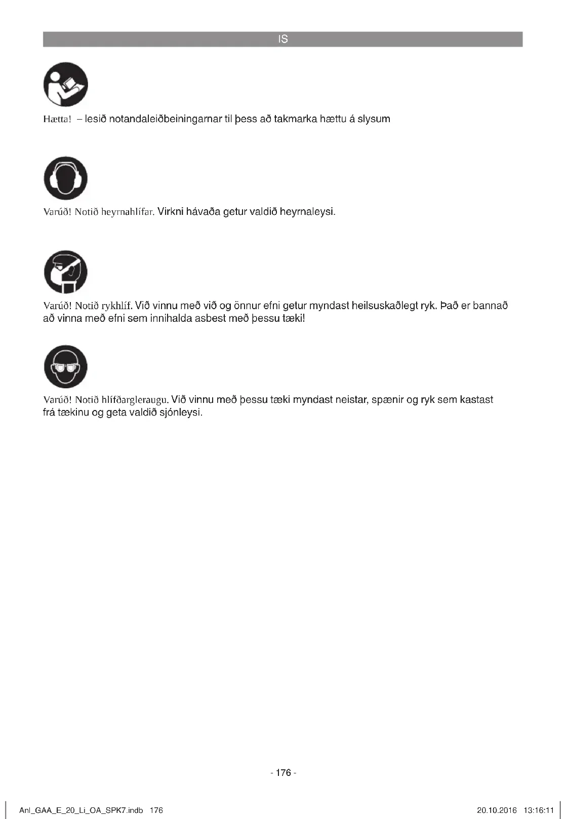 Hætta! – lesið notandaleiðbeiningarnar til þess að takmarka hættu á slysum Varúð! Notið heyrnahlífar. Virkni hávaða getur valdið heyrnaleysi. Varúð! Notið hlífðargleraugu. Við vinnu með þessu tæki myndast neistar, spænir og ryk sem kastast frá tækinu og geta valdið sjónleysi. Varúð! Notið rykhlíf. Við vinnu með við og önnur efni getur myndast heilsuskaðlegt ryk. Það er bannað að vinna með efni sem innihalda asbest með þessu tæki! Anl_GAA_E_20_Li_OA_SPK7.indb 176Anl_GAA_E_20_Li_OA_SPK7.indb 176 20.10.2016 13:16:1120.10.2016 13:16:11IS