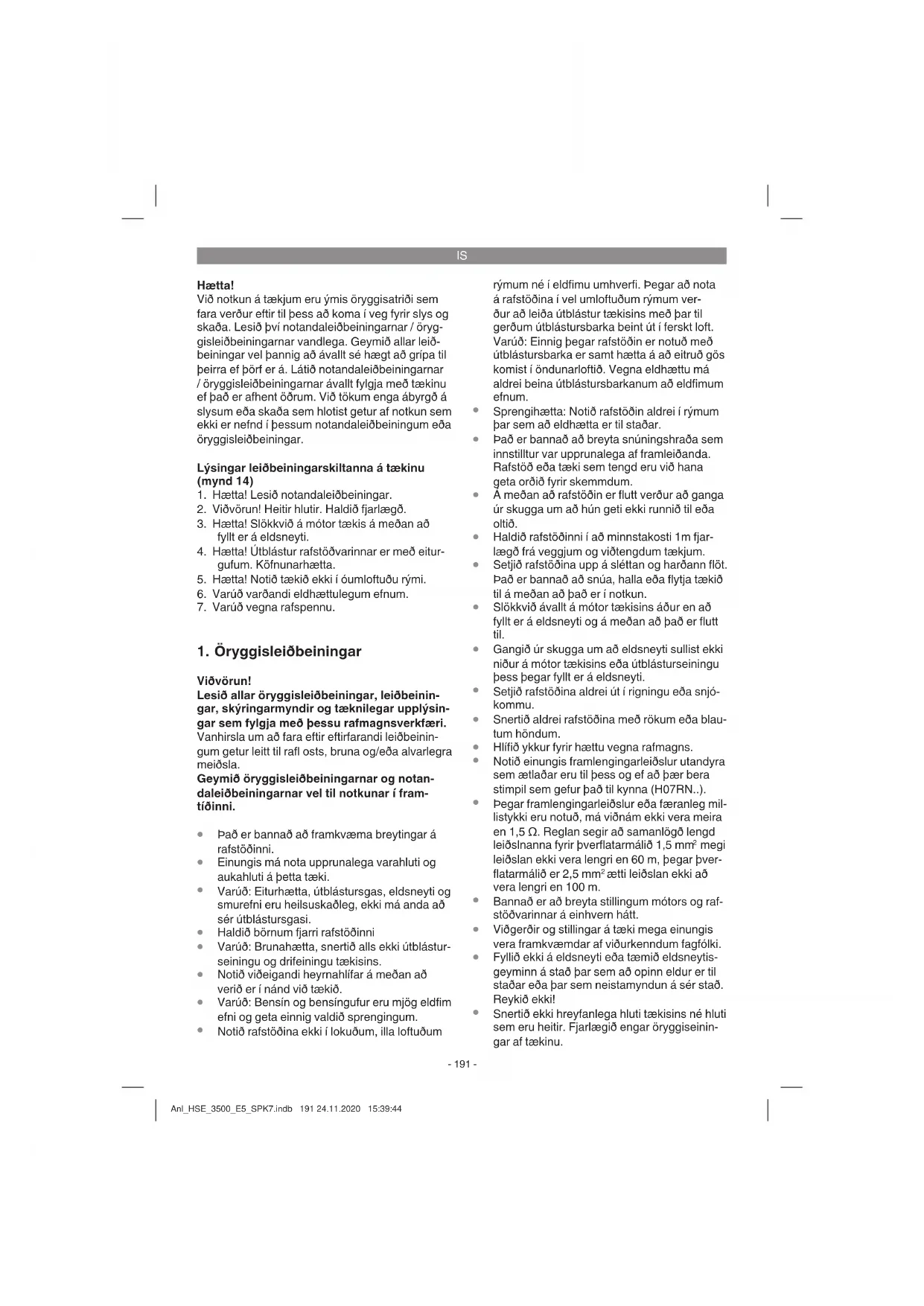 Rafstöðin er útbúin álagsöryggi. Það rýfur sam- bandið við viðeigandi innstungu ef álag er of mikið. Varúð! Ef svo er verður að minnkar rafnotkun- ina sem rafstöðin þarf að skapa eða fjarlægið skemmd tæki sem tengd eru við rafstöðina. Varúð! Ef ofálagsrofi skemmist, má einungis setja annan nákvæmlega samskonar rofa í hans stað. Ef svo er, hafi ð þá samband við þjónustuaðila. Anl_HSE_3500_E5_SPK7.indb 194 24.11.2020 15:39:45IS