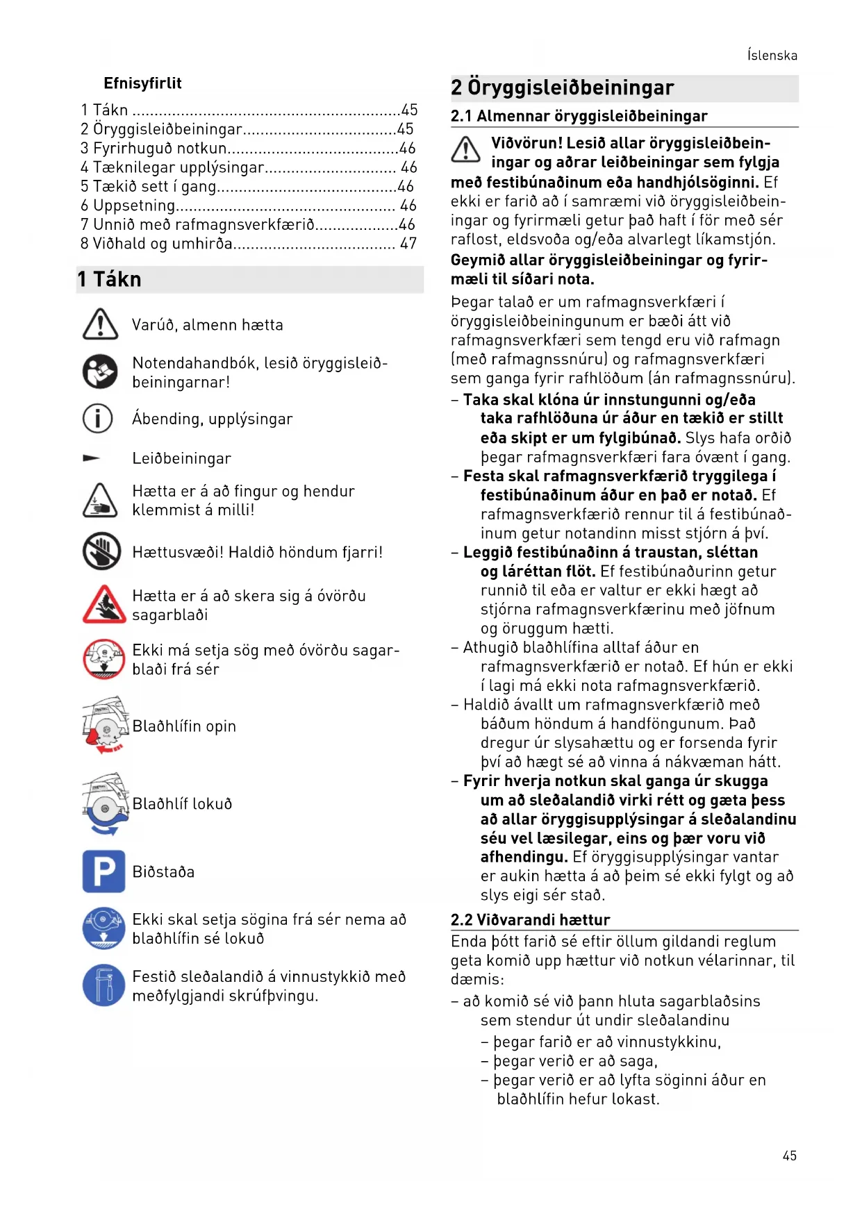 - 8 Viðhald og umhirða 1 Tákn Varúð, almenn hætta Notendahandbók, lesið öryggisleið beiningarnar! Ábending, upplýsingar Leiðbeiningar Hætta er á að fingur og hendur klemmist á milli! Hættusvæði! Haldið höndum fjarri! Hætta er á að skera sig á óvörðu sagarblaði Ekki má setja sög með óvörðu sagar blaði frá sér HKC 55 EB www.fe p. 47