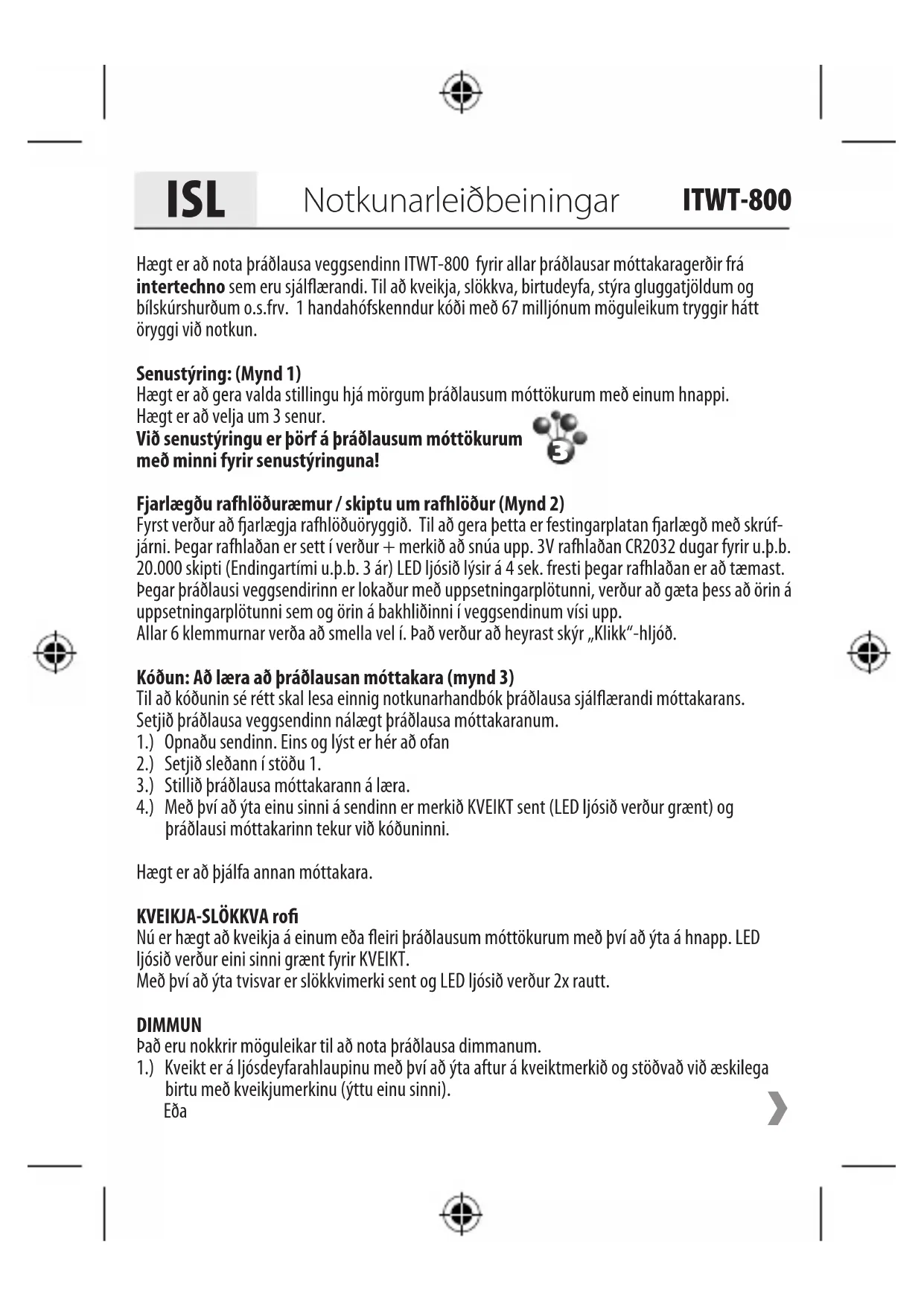 Istruzioni d’uso ITWT-800Hægt er að nota þráðlausa veggsendinn ITWT-800 fyrir allar þráðlausar móttakaragerðir frá intertechno sem eru sjálflærandi. Til að kveikja, slökkva, birtudeyfa, stýra gluggatjöldum og bílskúrshurðum o.s.frv. 1 handahófskenndur kóði með 67 milljónum möguleikum tryggir hátt öryggi við notkun. Senustýring: (Mynd 1)Hægt er að gera valda stillingu hjá mörgum þráðlausum móttökurum með einum hnappi.Hægt er að velja um 3 senur. Við senustýringu er þörf á þráðlausum móttökurum með minni fyrir senustýringuna! Fjarlægðu rafhlöðuræmur / skiptu um rafhlöður (Mynd 2)Fyrst verður að arlægja rafhlöðuöryggið. Til að gera þetta er festingarplatan arlægð með skrúf-járni. Þegar rafhlaðan er sett í verður + merkið að snúa upp. 3V rafhlaðan CR2032 dugar fyrir u.þ.b. 20.000 skipti (Endingartími u.þ.b. 3 ár) LED ljósið lýsir á 4 sek. fresti þegar rafhlaðan er að tæmast.Þegar þráðlausi veggsendirinn er lokaður með uppsetningarplötunni, verður að gæta þess að örin á uppsetningarplötunni sem og örin á bakhliðinni í veggsendinum vísi upp.Allar 6 klemmurnar verða að smella vel í. Það verður að heyrast skýr „Klikk“-hljóð.Kóðun: Að læra að þráðlausan móttakara (mynd 3)Til að kóðunin sé rétt skal lesa einnig notkunarhandbók þráðlausa sjálflærandi móttakarans.Setjið þráðlausa veggsendinn nálægt þráðlausa móttakaranum.1.) Opnaðu sendinn. Eins og lýst er hér að ofan 2.) Setjið sleðann í stöðu 1.3.) Stillið þráðlausa móttakarann á læra.4.) Með því að ýta einu sinni á sendinn er merkið KVEIKT sent (LED ljósið verður grænt) og þráðlausi móttakarinn tekur við kóðuninni.Hægt er að þjálfa annan móttakara.KVEIKJA-SLÖKKVA rofiNú er hægt að kveikja á einum eða fleiri þráðlausum móttökurum með því að ýta á hnapp. LED ljósið verður eini sinni grænt fyrir KVEIKT. Með því að ýta tvisvar er slökkvimerki sent og LED ljósið verður 2x rautt.DIMMUNÞað eru nokkrir möguleikar til að nota þráðlausa dimmanum. 1.) Kveikt er á ljósdeyfarahlaupinu með því að ýta aftur á kveiktmerkið og stöðvað við æskilega birtu með kveikjumerkinu (ýttu einu sinni). Eða Notkunarleiðbeiningar ISL