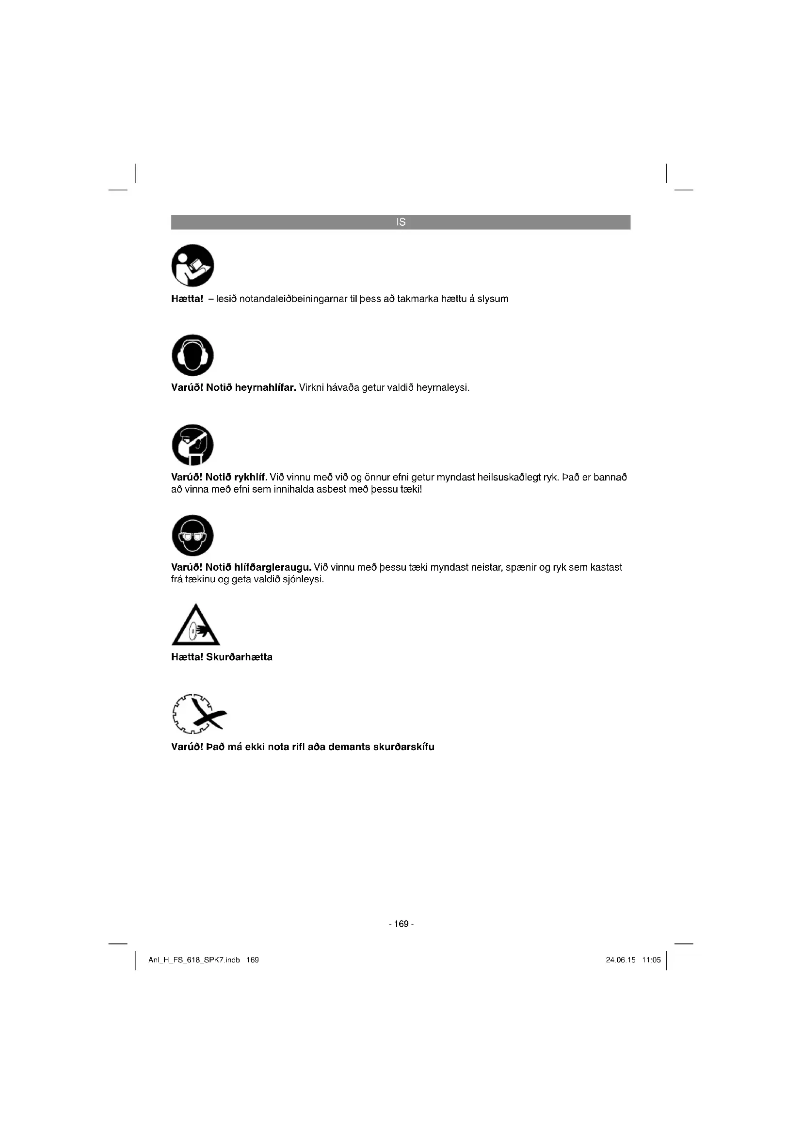 Hætta! – lesið notandaleiðbeiningarnar til þess að takmarka hættu á slysum Varúð! Notið heyrnahlífar. Virkni hávaða getur valdið heyrnaleysi. Varúð! Notið hlífðargleraugu. Við vinnu með þessu tæki myndast neistar, spænir og ryk sem kastast frá tækinu og geta valdið sjónleysi. Varúð! Notið rykhlíf. Við vinnu með við og önnur efni getur myndast heilsuskaðlegt ryk. Það er bannað að vinna með efni sem innihalda asbest með þessu tæki! Hætta! Skurðarhætta Varúð! Það má ekki nota rifl aða demants skurðarskífu Anl_H_FS_618_SPK7.indb 169Anl_H_FS_618_SPK7.indb 169 24.06.15 11:0524.06.15 11:05IS