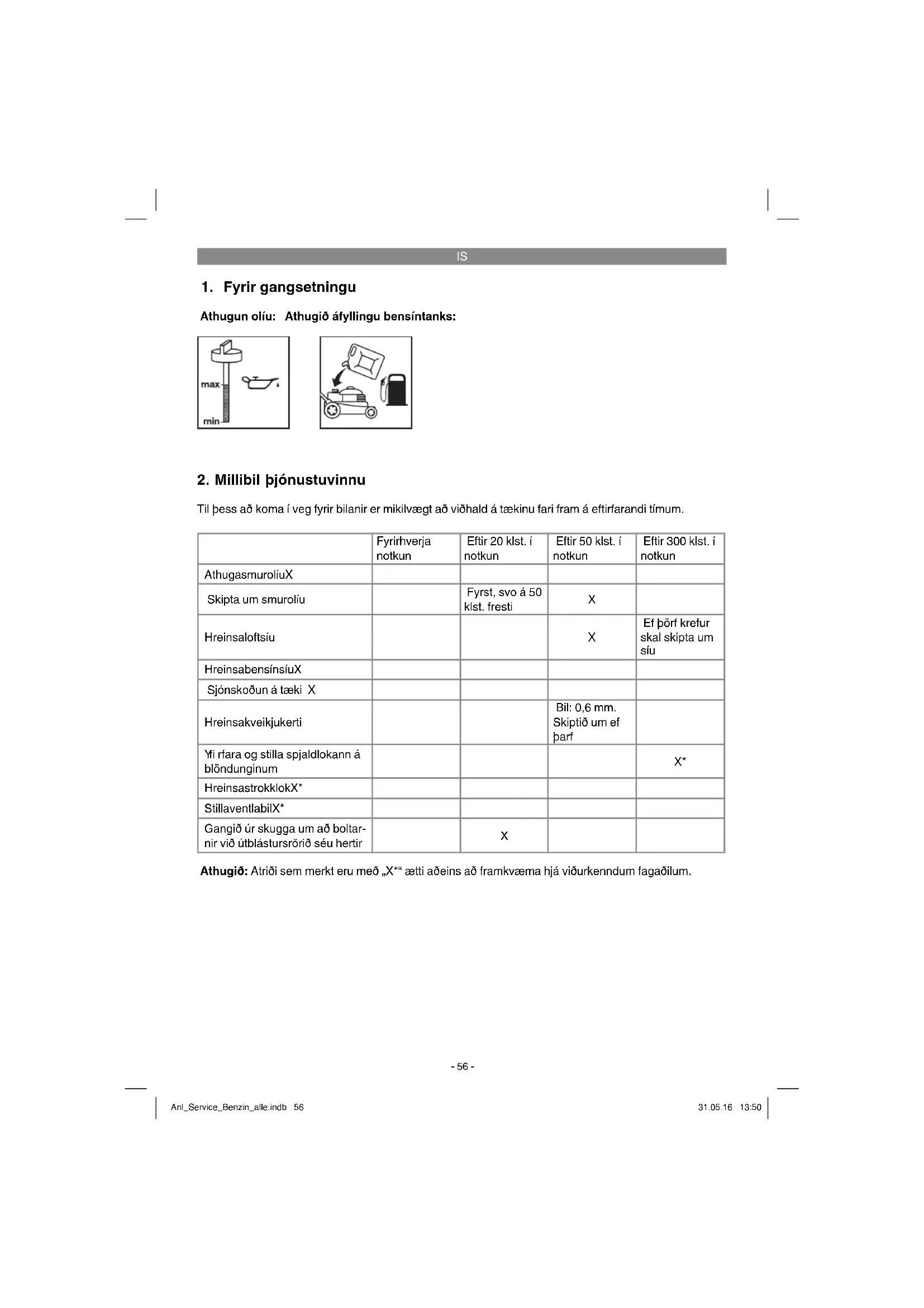 Athugið: Atriði sem merkt eru með „X*“ ætti aðeins að framkvæma hjá viðurkenndum fagaðilum. Anl_Service_Benzin_alle.indb 56Anl_Service_Benzin_alle.indb 56 31.05.16 13:5031.05.16 13:50IS