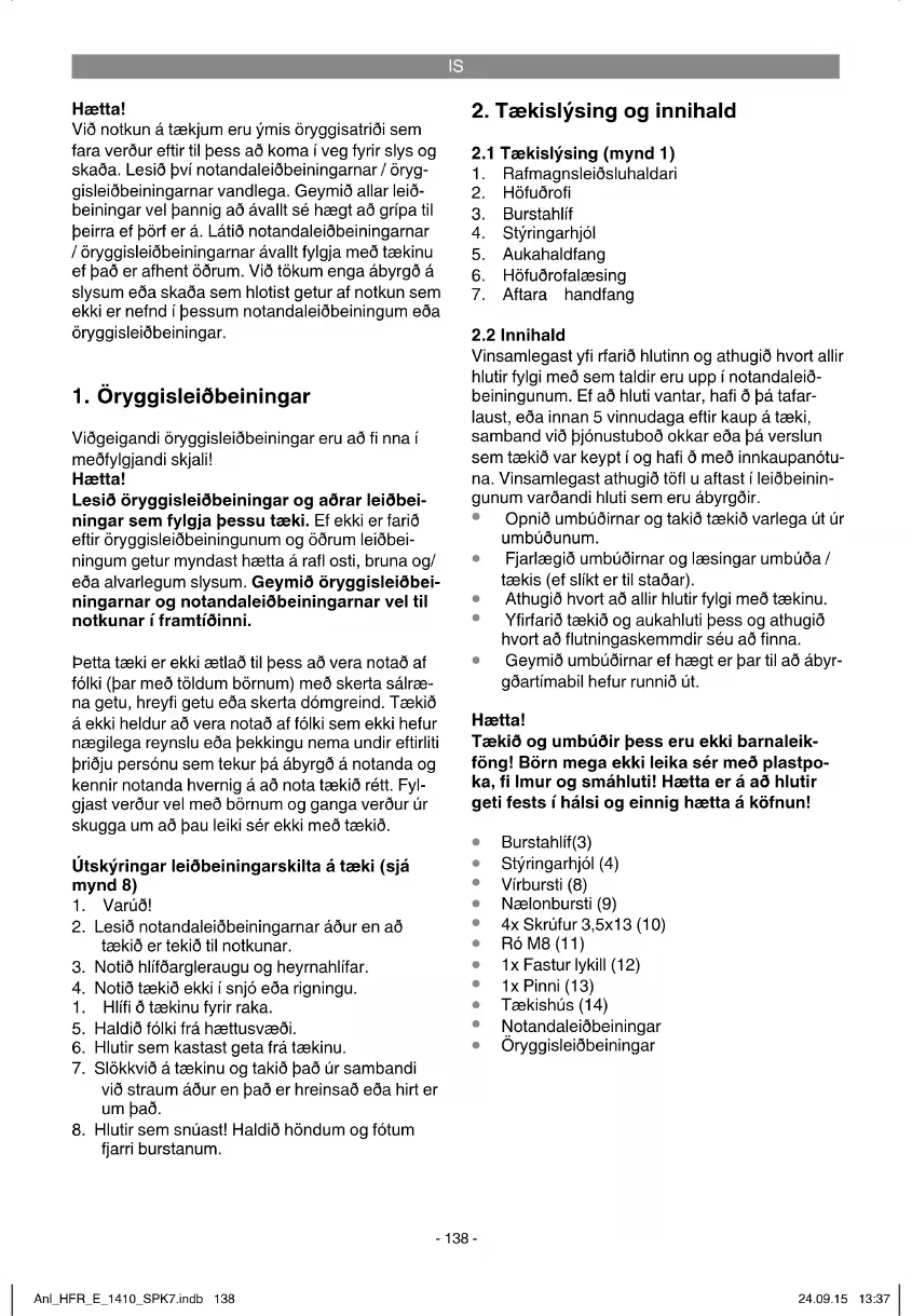 Sérstök skilyrði fyrir lönd Evrópubandalagsins: Kastið ekki notuðum rafmagnstækjum í vanalega ruslatunnu. Samkvæmt reglugerð fyrir Evrópu 2012/19/EU um gömul rafmangstæki og samkvæmt breytingum í lagasetningu hverrar þjóðar sambandsins verður að safna raftækjum aðskilið og koma fleim í sérstaka endurvinnslu í flágu umhverfi sverndar. Í staðinn fyrir að senda tækin til baka er eigandi þeirra hvattur til að vinna að því að rétt endurvinnsla eigi sér stað þegar hann afsalar sér tækinu sem eigandi. það er mögulegt að afhenda tækið til sérstakrar söfnunarstofnunar, sem sér um endurvinnslu tækisins samkvæmt lögum hinna ýmsu þjóða um endur- vinnslu og sorp. þetta á samt ekki við um viðbótarhluti, sem innihalda ekki rafmagnshluta. Eftirprentun eða önnur fjölprentun fylgiskjala og leiðarvísa vörunnar, líka í úrdrætti, er ekki leyfi leg nema grerinilegt samflykki frá iSC GmbH komi til. Það er áskilið að tæknilegar breytingar séu leyfi legar Anl_HFR_E_1410_SPK7.indb 142Anl_HFR_E_1410_SPK7.indb 142 24.09.15 13:3724.09.15 13:37IS