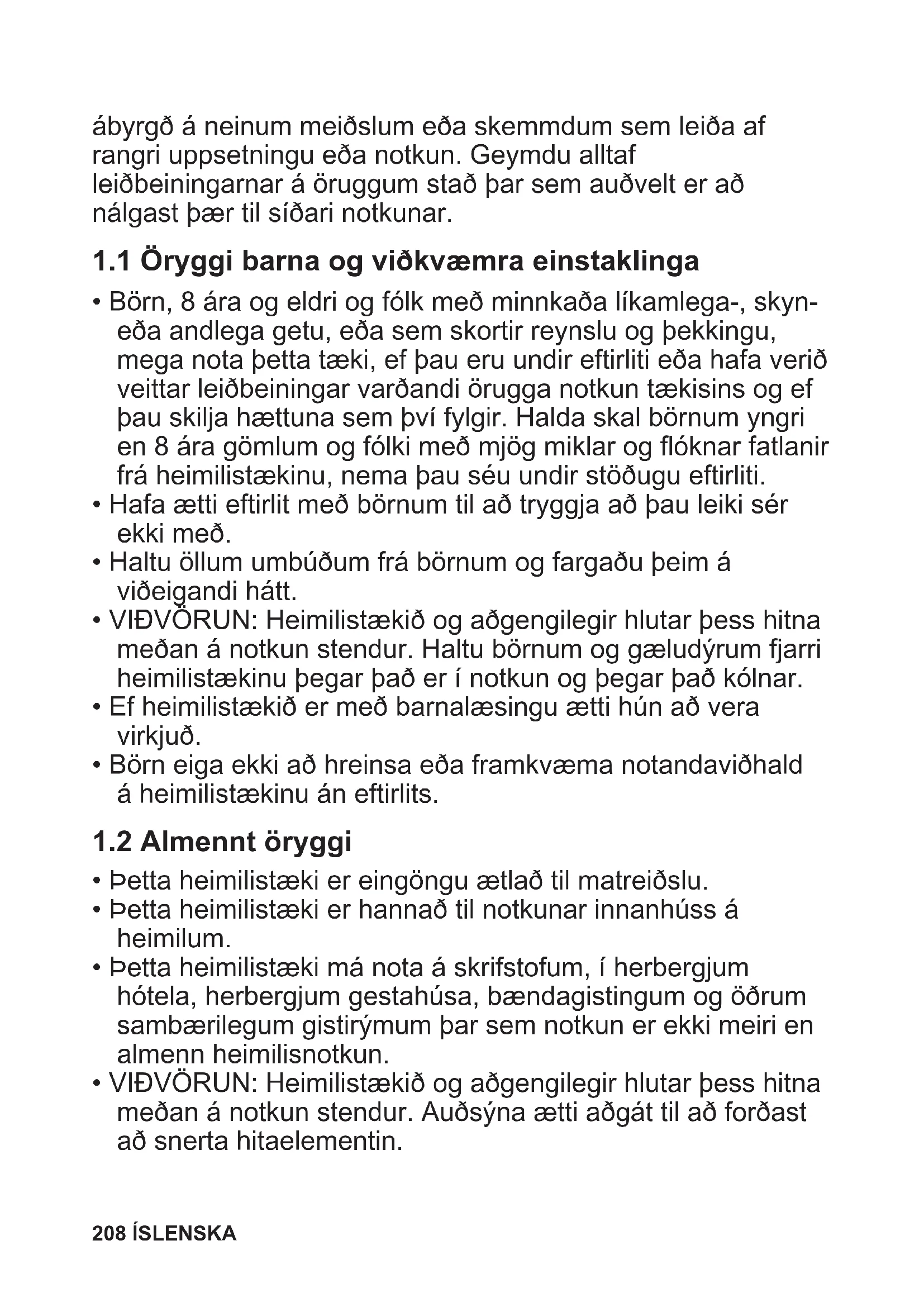 - Börn, 8 ára og eldri og fólk með minnkaða líkamlega-, skyn- eða andlega getu, eða sem skortir reynslu og þekkingu, mega nota þetta tæki, ef þau eru undir eftirliti eða hafa verið veittar leiðbeiningar varðandi örugga notkun tækisins og ef þau skilja hættuna sem því fylgir. Halda skal börnum yngri en 8 ára gömlum og fólki með mjög miklar og flóknar fatlanir frá heimilistækinu, nema þau séu undir stöðugu eftirliti.