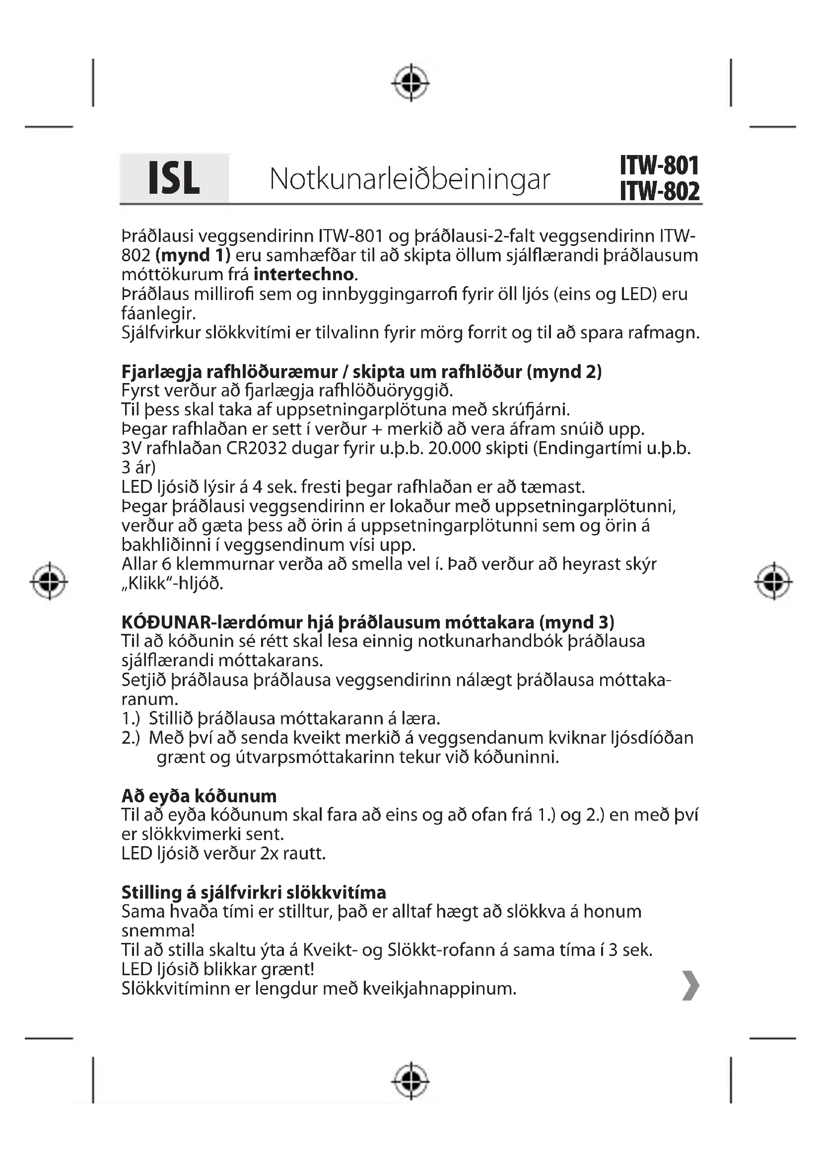 Istruzioni d’uso ITW-801 ITW-802Þráðlausi veggsendirinn ITW-801 og þráðlausi-2-falt veggsendirinn ITW- 802 (mynd 1) eru samhæfðar til að skipta öllum sjálflærandi þráðlausum móttökurum frá intertechno. Þráðlaus millirofi sem og innbyggingarrofi fyrir öll ljós (eins og LED) eru fáanlegir. Sjálfvirkur slökkvitími er tilvalinn fyrir mörg forrit og til að spara rafmagn. Fjarlægja rafhlöðuræmur / skipta um rafhlöður (mynd 2) Fyrst verður að arlægja rafhlöðuöryggið. Til þess skal taka af uppsetningarplötuna með skrúárni. Þegar rafhlaðan er sett í verður + merkið að vera áfram snúið upp. 3V rafhlaðan CR2032 dugar fyrir u.þ.b. 20.000 skipti (Endingartími u.þ.b. 3 ár) LED ljósið lýsir á 4 sek. fresti þegar rafhlaðan er að tæmast. Þegar þráðlausi veggsendirinn er lokaður með uppsetningarplötunni, verður að gæta þess að örin á uppsetningarplötunni sem og örin á bakhliðinni í veggsendinum vísi upp. Allar 6 klemmurnar verða að smella vel í. Það verður að heyrast skýr „Klikk“-hljóð. KÓÐUNAR-lærdómur hjá þráðlausum móttakara (mynd 3) Til að kóðunin sé rétt skal lesa einnig notkunarhandbók þráðlausa sjálflærandi móttakarans. Setjið þráðlausa þráðlausa veggsendirinn nálægt þráðlausa móttaka- ranum. 1.) Stillið þráðlausa móttakarann á læra. 2.) Með því að senda kveikt merkið á veggsendanum kviknar ljósdíóðan grænt og útvarpsmóttakarinn tekur við kóðuninni. Að eyða kóðunum Til að eyða kóðunum skal fara að eins og að ofan frá 1.) og 2.) en með því er slökkvimerki sent. LED ljósið verður 2x rautt. Stilling á sjálfvirkri slökkvitíma Sama hvaða tími er stilltur, það er alltaf hægt að slökkva á honum snemma! Til að stilla skaltu ýta á Kveikt- og Slökkt-rofann á sama tíma í 3 sek. LED ljósið blikkar grænt! Slökkvitíminn er lengdur með kveikjahnappinum. Notkunarleiðbeiningar ISL