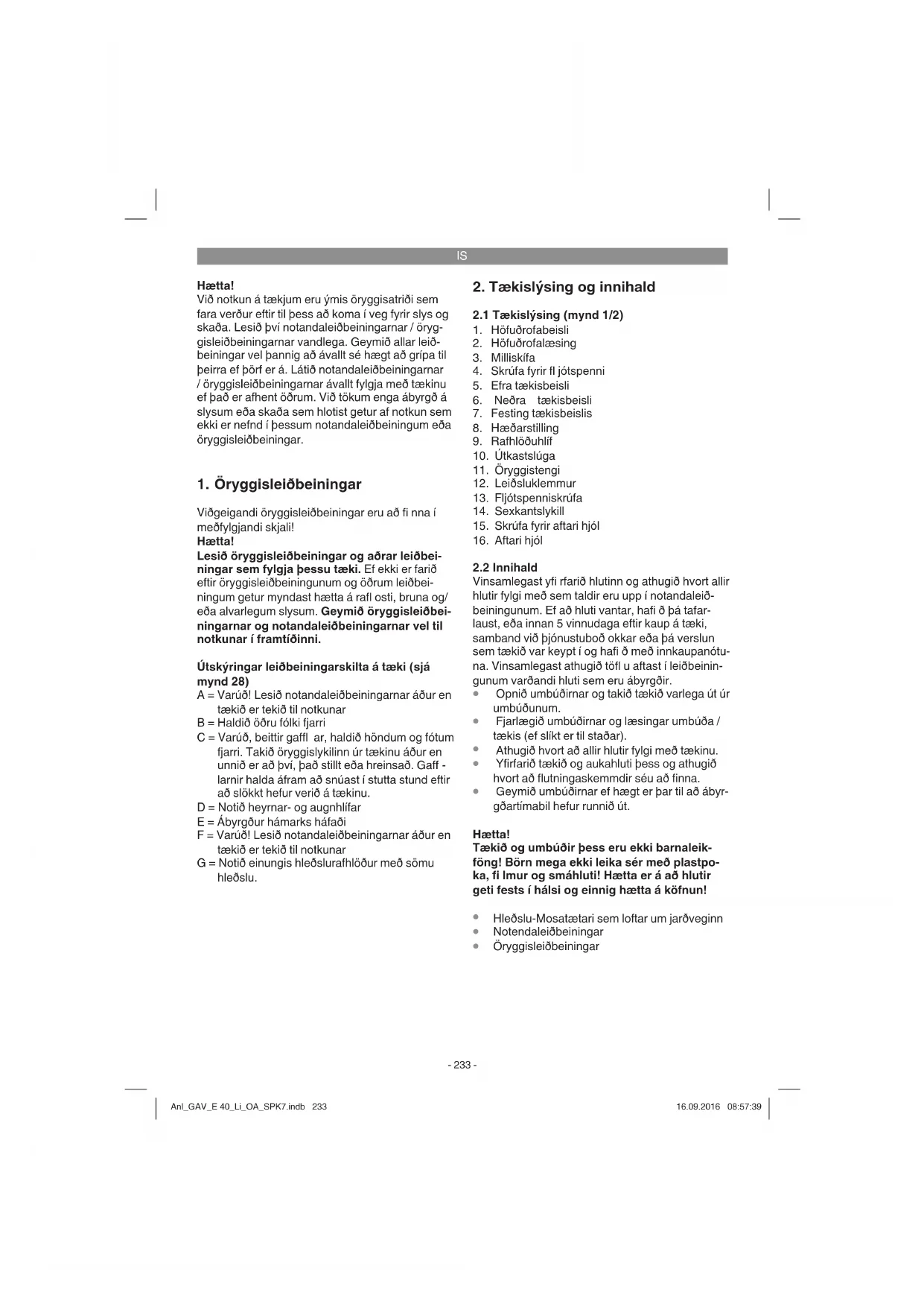 Sérstök skilyrði fyrir lönd Evrópubandalagsins: Kastið ekki notuðum rafmagnstækjum í vanalega ruslatunnu. Samkvæmt reglugerð fyrir Evrópu 2012/19/EU um gömul rafmangstæki og samkvæmt breytingum í lagasetningu hverrar þjóðar sambandsins verður að safna raftækjum aðskilið og koma fleim í sérstaka endurvinnslu í flágu umhverfi sverndar. Í staðinn fyrir að senda tækin til baka er eigandi þeirra hvattur til að vinna að því að rétt endurvinnsla eigi sér stað þegar hann afsalar sér tækinu sem eigandi. það er mögulegt að afhenda tækið til sérstakrar söfnunarstofnunar, sem sér um endurvinnslu tækisins samkvæmt lögum hinna ýmsu þjóða um endur- vinnslu og sorp. þetta á samt ekki við um viðbótarhluti, sem innihalda ekki rafmagnshluta. Eftirprentun eða önnur fjölprentun fylgiskjala og leiðarvísa vörunnar, líka í úrdrætti, er ekki leyfi leg nema grerinilegt samflykki frá iSC GmbH komi til. Það er áskilið að tæknilegar breytingar séu leyfi legar Anl_GAV_E 40_Li_OA_SPK7.indb 242Anl_GAV_E 40_Li_OA_SPK7.indb 242 16.09.2016 08:57:4016.09.2016 08:57:40IS