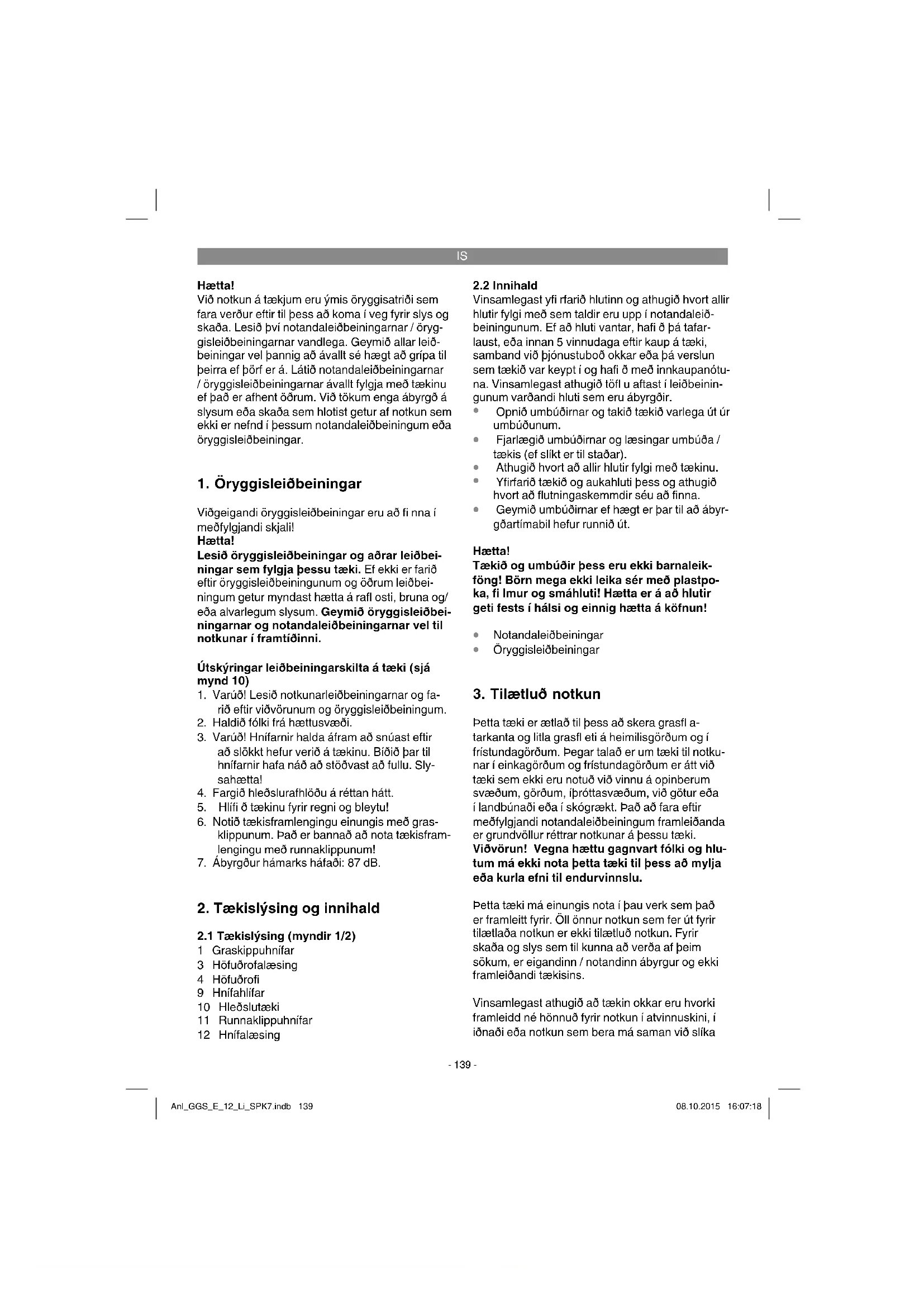 Þetta tæki er ætlað til þess að skera grasfl a- tarkanta og litla grasfl eti á heimilisgörðum og í frístundagörðum. Þegar talað er um tæki til notku- nar í einkagörðum og frístundagörðum er átt við tæki sem ekki eru notuð við vinnu á opinberum svæðum, görðum, íþróttasvæðum, við götur eða í landbúnaði eða í skógrækt. Það að fara eftir meðfylgjandi notandaleiðbeiningum framleiðanda er grundvöllur réttrar notkunar á þessu tæki. Viðvörun! Vegna hættu gagnvart fólki og hlu- tum má ekki nota þetta tæki til þess að mylja eða kurla efni til endurvinnslu. Þetta tæki má einungis nota í þau verk sem það er framleitt fyrir. Öll önnur notkun sem fer út fyrir tilætlaða notkun er ekki tilætluð notkun. Fyrir skaða og slys sem til kunna að verða af þeim sökum, er eigandinn / notandinn ábyrgur og ekki framleiðandi tækisins. Vinsamlegast athugið að tækin okkar eru hvorki framleidd né hönnuð fyrir notkun í atvinnuskini, í iðnaði eða notkun sem bera má saman við slíka Anl_GGS_E_12_Li_SPK7.indb 139Anl_GGS_E_12_Li_SPK7.indb 139 08.10.2015 16:07:1808.10.2015 16:07:18IS