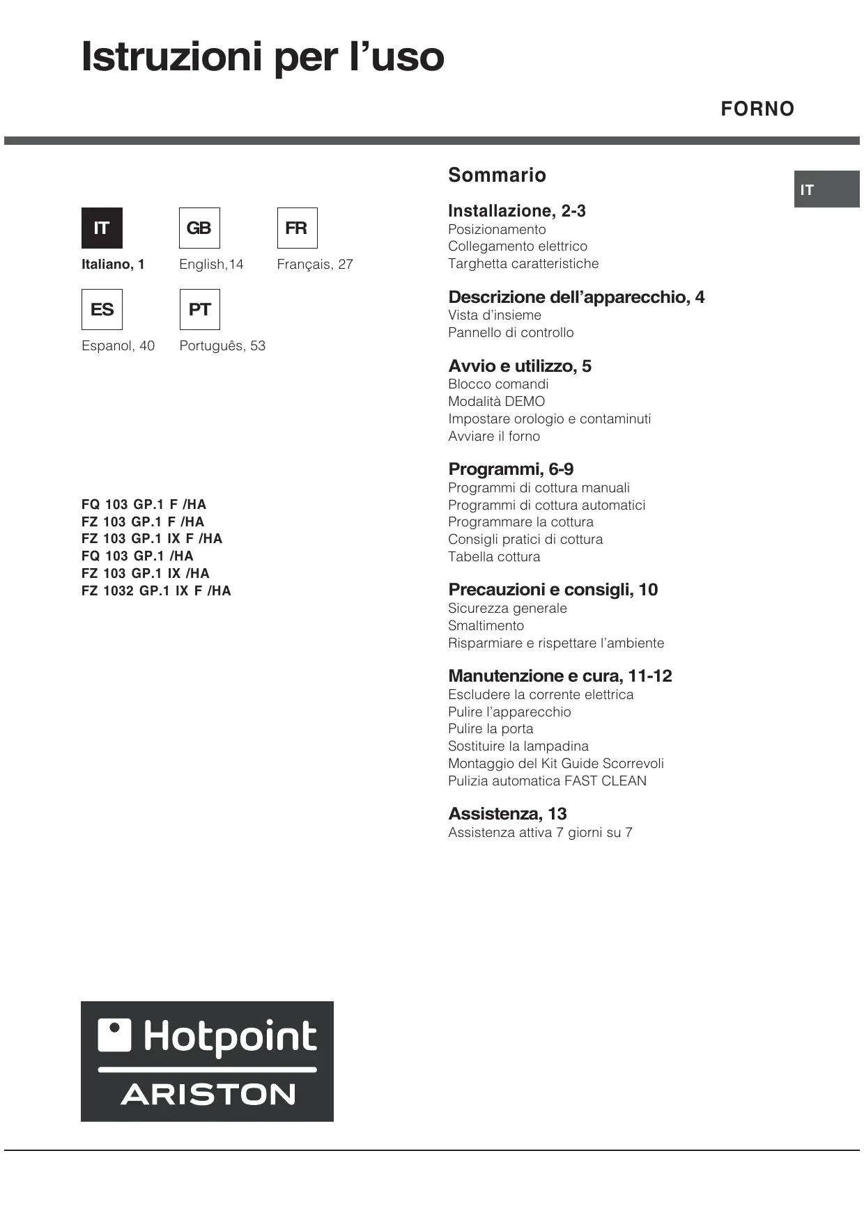Français, 27 Installazione, 2-3 Posizionamento Collegamento elettrico Targhetta caratteristiche Descrizione dellapparecchio, 4 Vista dinsieme Pannello di controllo Avvio e utilizzo, 5 Blocco comandi Modalità DEMO Impostare orologio e contaminuti Avviare il forno Programmi, 6-9 FQ 103 GP.1 F /HA FZ 103 GP.1 F /HA FZ 103 GP.1 IX F /HA FQ 103 GP.1 /HA FZ 103 GP.1 IX /HA FZ 1032 GP.1 IX F /HA Programmi di cottura manuali Programmi di cottura automatici Programmare la cottura Consigli pratici di cottura Tabella cottura Precauzioni e consigli, 10 Sicurezza generale Smaltimento Risparmiare e rispettare lambiente Manutenzione e cura, 11-12 Escludere la corrente elettrica Pulire lapparecchio Pulire la porta Sostituire la lampadina Montaggio del Kit Guide Scorrevoli Pulizia automatica FAST CLEAN Assistenza, 13 Assistenza attiva 7 giorni su 7