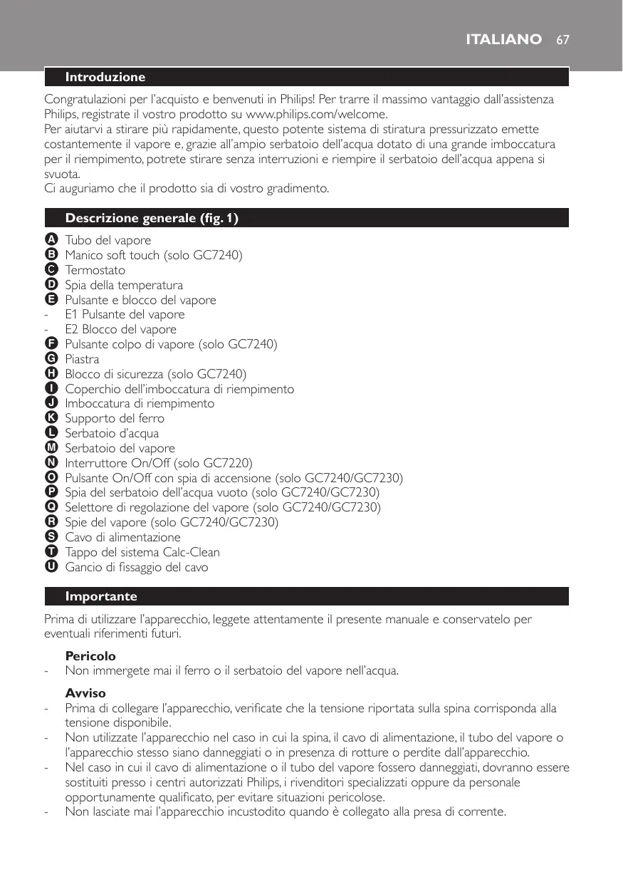 Tubo del vapore Manico soft touch (solo GC7240) Termostato Spia della temperatura Pulsante e blocco del vapore E1 Pulsante del vapore E2 Blocco del vapore Pulsante colpo di vapore (solo GC7240) Piastra Blocco di sicurezza (solo GC7240) Coperchio dell’imboccatura di riempimento Imboccatura di riempimento Supporto del ferro Serbatoio d’acqua Serbatoio del vapore Interruttore On/Off (solo GC7220) Pulsante On/Off con spia di accensione (solo GC7240/GC7230) Spia del serbatoio dell’acqua vuoto (solo GC7240/GC7230) Selettore di regolazione del vapore (solo GC7240/GC7230) Spie del vapore (solo GC7240/GC7230) Cavo di alimentazione Tappo del sistema Calc-Clean Gancio di fissaggio del cavo Importante Prima di utilizzare l’apparecchio, leggete attentamente il presente manuale e conservatelo per eventuali riferimenti futuri.