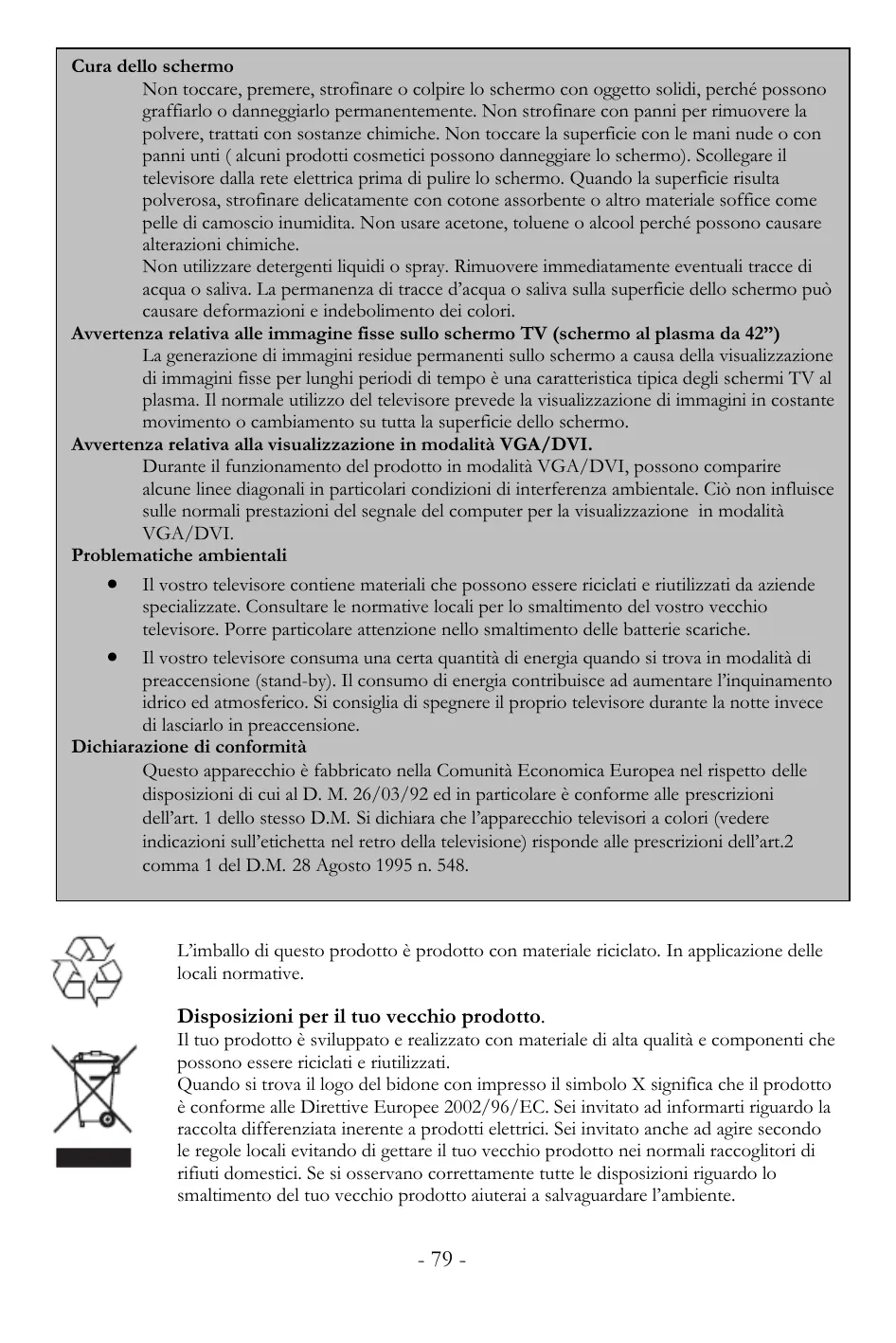 - Il vostro televisore consuma una certa quantità di energia quando si trova in modalità di preaccensione (stand-by). Il consumo di energia contribuisce ad aumentare l’inquinamento idrico ed atmosferico. Si consiglia di spegnere il proprio televisore durante la notte invece di lasciarlo in preaccensione. Dichiarazione di conformità Questo apparecchio è fabbricato nella Comunità Economica Europea nel rispetto delle disposizioni di cui al D. M. 26/03/92 ed in particolare è conforme alle prescrizioni dell’art. 1 dello stesso D.M. Si dichiara che l’apparecchio televisori a colori (vedere indicazioni sull’etichetta nel retro della televisione) risponde alle prescrizioni dell’art.2 comma 1 del D.M. 28 Agosto 1995 n. 548. L’imballo di questo prodotto è prodotto con materiale riciclato. In applicazione delle locali normative. Disposizioni per il tuo vecchio prodotto. Il tuo prodotto è sviluppato e realizzato con materiale di alta qualità e componenti che possono essere riciclati e riutilizzati. Quando si trova il logo del bidone con impresso il simbolo X significa che il prodotto è conforme alle Direttive Europee 2002/96/EC. Sei invitato ad informarti riguardo la raccolta differenziata inerente a prodotti elettrici. Sei invitato anche ad agire secondo le regole locali evitando di gettare il tuo vecchio prodotto nei normali raccoglitori di rifiuti domestici. Se si osservano correttamente tutte le disposizioni riguardo lo smaltimento del tuo vecchio prodotto aiuterai a salvaguardare l’ambiente.