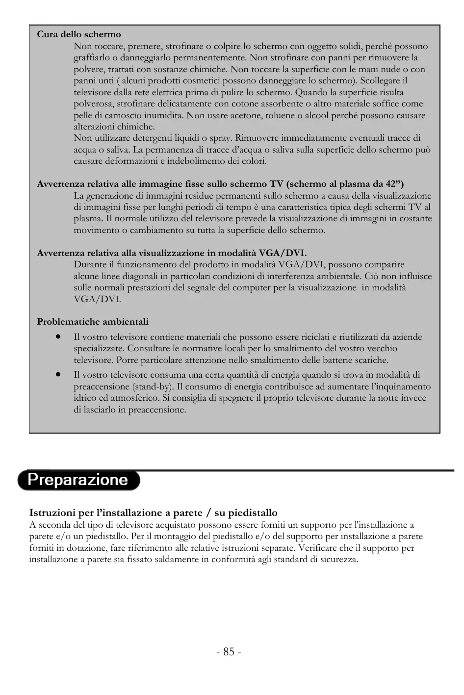 Aviso concerniente a imágenes fijas en la pantalla del televisor (42” Plasma) Es característico de las pantallas de Plasma que imágenes fijas que se muestran durante un largo periodo de tiempo se queden grabadas en la pantalla. Este efecto se llama quemado del fósforo. Normalmente el uso del televisor con pantalla de plasma supone la reproducción de imagines con movimiento continuo e imagines cambiantes que ocupan toda la pantalla. Aviso concerniente a los modos de visualización VGA/DVI Mientras el televisor este en modo de visualización VGA/DVI es posible que aparezcan líneas diagonales en la pantalla debido a interferencia ambiental. Estas interferencias no afectaran la calidad de la señal del ordenador que se visualice en modo VGA/DVI Medioambiente • Su televisor contiene materiales que pueden ser reciclados y reusados por compañías especializadas. Por favor infórmese sobre las regulaciones locales para la disposición de su viejo televisor, en especial la disposición de las baterías gastadas. • Su televisor consume energía en el modo Stand-by. Consumo de energía contribuye a la polución del aire y agua. Aconsejamos que apague su televisor por la noche en vez de dejarlo en el modo Stand-by